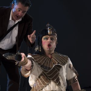 Tuttavia, a parte certe suggestioni visuali, la vera liaison des scènes tra i due lavori è rappresentata dagli interpreti, in particolare dal controtenore Rafał Tomkiewicz. Vessato in Radames dai tre registi che gli danno indicazioni del tutto contrastanti (alla fine morirà), nella seconda parte si trasforma in un Lohengrin mummificato, che non proferisce parola: totale negazione dell’eroe. Nei panni di Elsa – che non deve cantare, ma limitarsi a una suggestiva recitazione intonata – il soprano Céline Steudler: brava, intensa ed espressiva. Nella prima parte, invece, interpretava la petulante regista d’opera che dà indicazioni in italiano, avvalendosi solo di vocaboli estrapolati dal lessico musicale. Efficaci in scena e vocalmente sicuri anche il tenore Alexander Kaimbacher, che si esprimeva in tedesco, mentre il basso Javid Samadov era l’isterico regista cinematografico, di lingua inglese. A loro si è aggiunto il baritono Salvador Pérez come direttore di scena. I tre sono poi diventati il piccolo coro maschile che contrappunta lo Sprechgesang di Elsa nell’opera di Sciarrino.