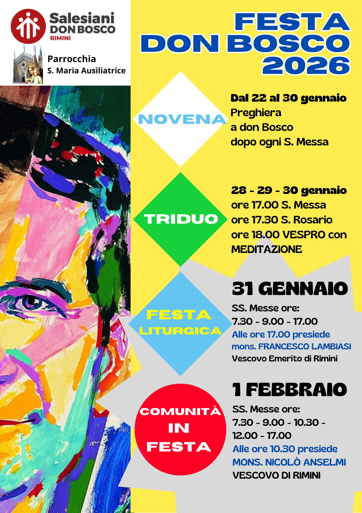 Il primo appuntamento è alle ore 10 del 30 gennaio con la Santa Messa animata dai bambini ed insegnanti dell’istituto “Maria Ausiliatrice” di Rimini. Si prosegue alle 17 con la Santa Messa del Triduo, alle 17.30 il Santo Rosario e per finire dalle 18, Vespro con meditazione (orari fissi anche per le date del 28 e 29 gennaio).