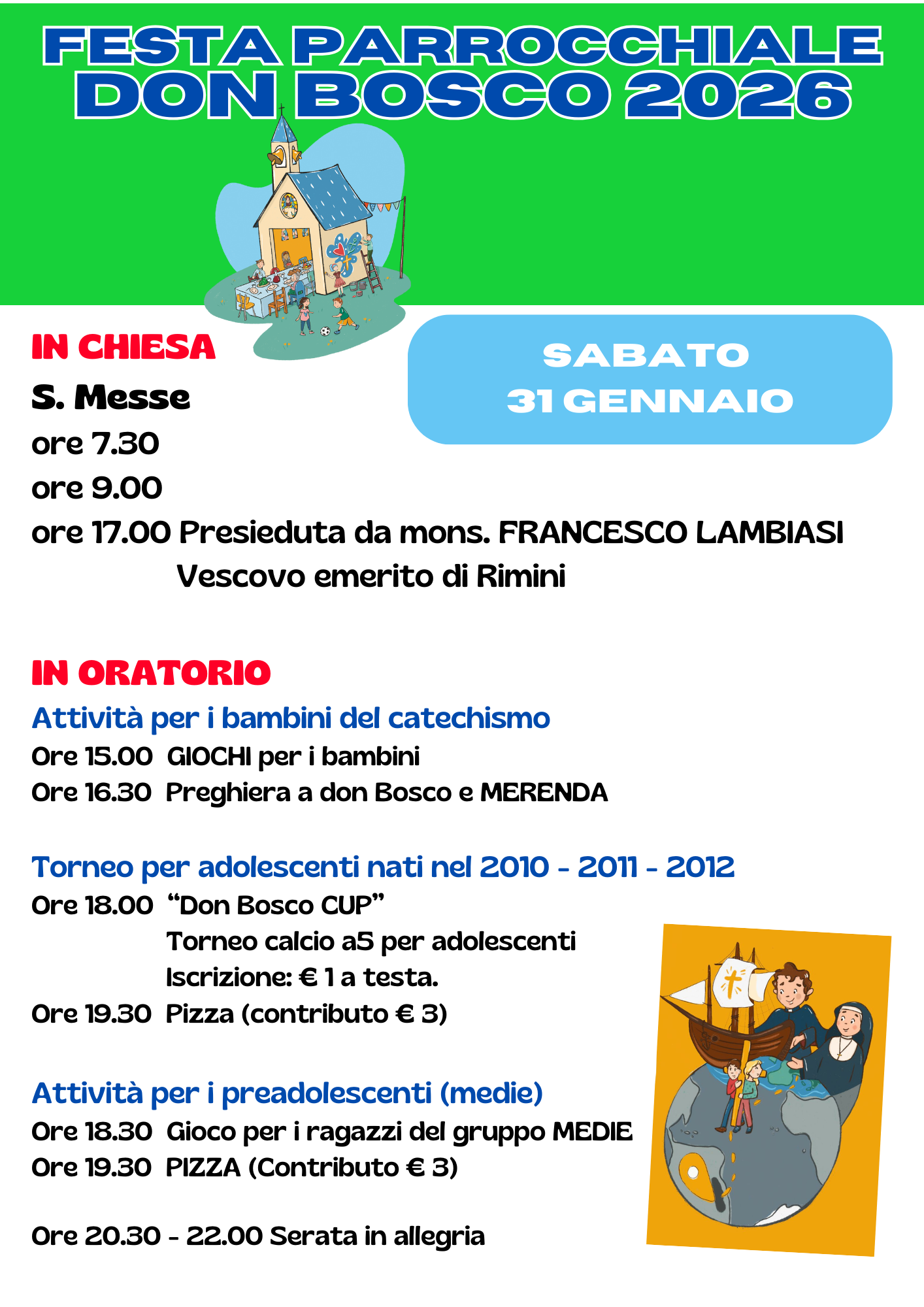 La mattina di sabato 31 gennaio la prima Messa è alle ore 7.30, seguita da quella delle 9 e ultima quella delle 17, presieduta da monsignor Francesco Lambiasi, Vescovo emerito di Rimini.