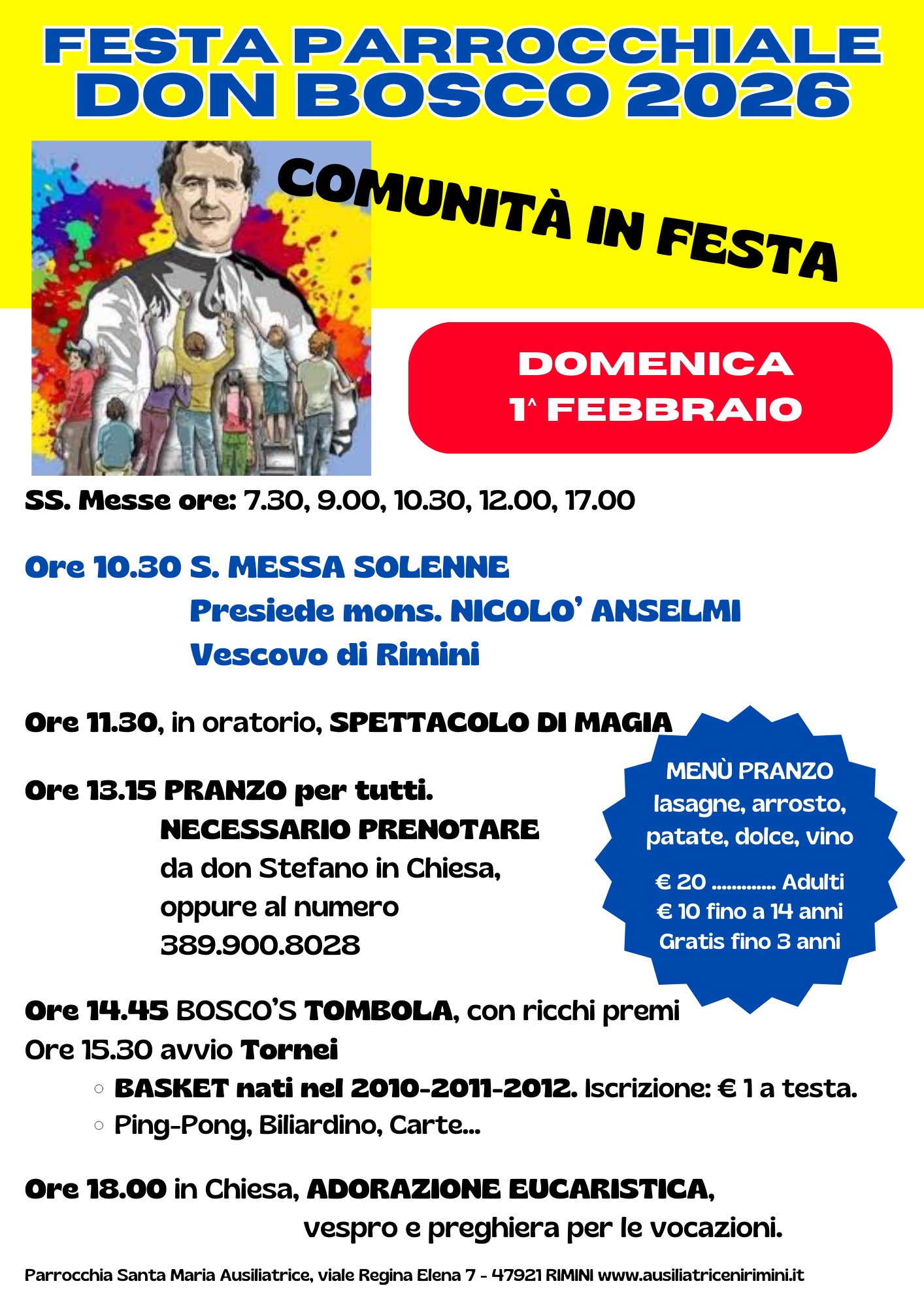 Alle 13.15 pranzo per tutti. Si ricorda di prenotare da don Stefano in Chiesa, oppure al numero 389.900.8028. Il menù prevede lasagne, arrosto, patate, dolce, vino (20 euro per gli adulti, 10 euro per i ragazzi fino a 14 anni, gratis per i bambini fino a 3 anni).