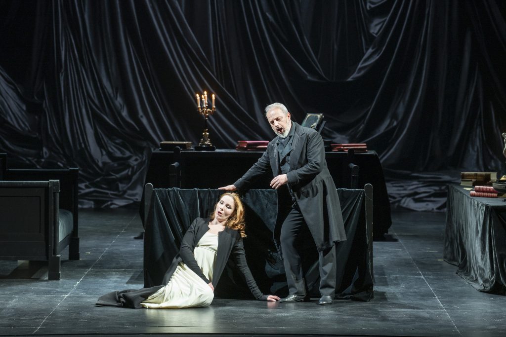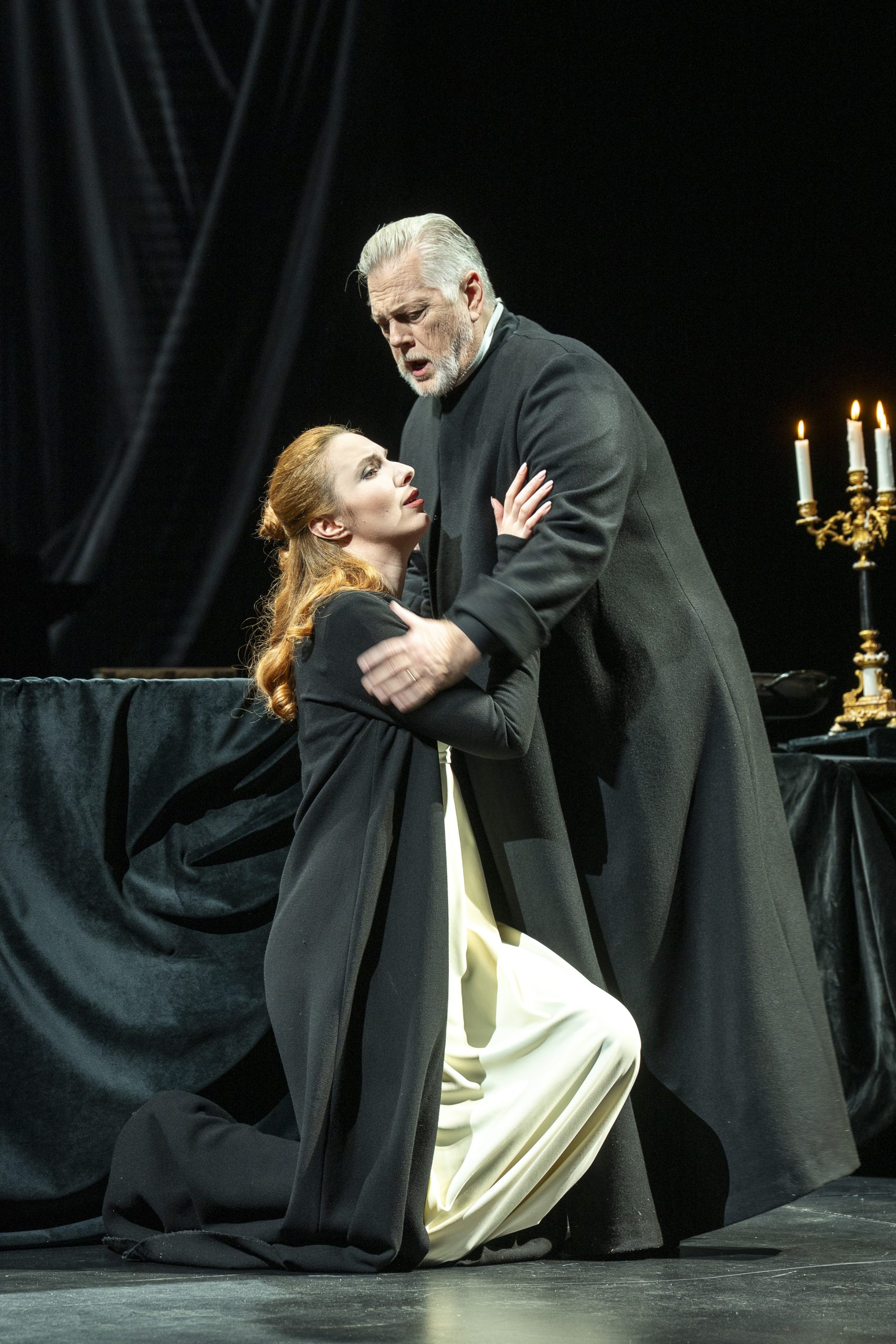 Terzetto protagonista dunque eccellente. A cominciare proprio dallo Stiffelio di Gregory Kunde, da qualche anno passato a Verdi dopo una lunga militanza rossiniana: anzi, è forse da questa consuetudine con il belcanto che deriva la sua straordinaria capacità di controllo vocale, a dispetto dell’anagrafe (settantadue anni fra un mese). Il tenore ha reso con straordinaria efficacia espressiva il conflitto interiore che attanaglia il protagonista, in virtù di un canto che, se con il tempo ha perso qualcosa in termini timbrici, resta formidabile per risonanza e densità interpretativa. Sua moglie Lina è la giovane Lidia Fridman, soprano dall’emissione sempre impeccabile e sicura, scandita da fiati lunghissimi: una figura astratta e quasi immateriale tanto è diafana e filiforme, capace però di esprimere con grande intensità (vedi l’aria Ah! dagli scanni eterei) il suo turbamento per i cedimenti avuti in assenza del marito. Nei panni del vecchio padre Stankar, preoccupato di difendere un’astratta idea di onore della famiglia, Vladimir Stoyanov è stato in grado ancora una volta di rispondere a tutti i desiderata del baritono verdiano, in termini di scorrevolezza della linea vocale non meno che di accento e fraseggio. Bello e giovane, il tenore Carlo Raffaelli ha evidenziato apprezzabile precisione, ed è apparso adattissimo sul versante scenico a incarnare il fatuo tentatore di Lina. Completava il quintetto protagonistico Adriano Gramigni, che ha interpretato il vecchio ministro Jorg con una voce di basso forse meno ieratica del dovuto.