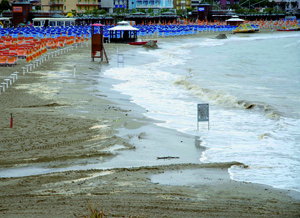 L’Adriatico affamato mangia anche Rimini nord, dove oltre all’erosione c’è da combattere anche ghiaia, fango e acqua poco limpida. È il caso di Rivabella, ad esempio. Dito puntato sul deviatore del fiume Marecchia, che scarica in mare fango e sassi. Ma sono tutti e sette i km del litorale nord ad essere tradizionalmente colpiti dall’erosione: qui si concentrano infatti gli sforzi del Comune di Rimini. Nel 2010 Palazzo Garampi investì 61mila euro, addirittura 190mila nel 2009. Altri 200mila euro sono stati “spalmati” sempre la scorsa stagione sull’intera provincia dal Stb, Servizio tecnico bacini Romagna, a cura della Regione. Ma tutti i comuni da Misano a Bellaria ogni anno sborsano migliaia di euro per “spalmare” migliaia di metri cubi di sabbia nei tratti più colpiti, ed eliminarla dove invece è più sedimentata.