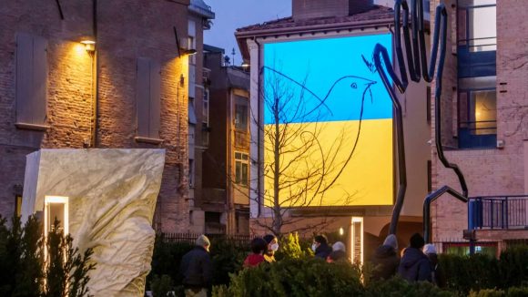 Domenica 27 Rimini esprime la sua vicinanza al popolo ucraino anche con un’installazione grafica sull’esterno del Palazzo del Fulgor. Sullo sfondo della bandiera ucraina viene proiettato un video animato con una colomba. A concludere il filmato, compare la parola MHp, che sia in lingua russa sia ucraina significa ‘pace’.