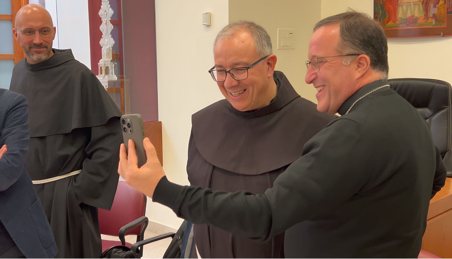 Una presenza che ha dovuto affrontare diverse sfide durante il corso dei secoli, con situazioni geopolitiche, sociali e anche religiose diversissime”, conferma il custode, padre Francesco Ielpo (nella foto al centro, col Vescovo Beneventi a destra) con una sottolineatura. “Ciò che ha caratterizzato questa presenza è stato sempre l’esserci, il rimanere non solo accanto ai luoghi santi, ma anche alle persone. Perché ogni uomo, ogni donna, ha bisogno di tutto ciò che materialmente serve alla vita: cibo, medicine, casa, lavoro, istruzione. Tutte opere che sono poi nate nel corso dei secoli e che continuano tutt’oggi. Per vivere abbiamo bisogno anche di uno sguardo su di noi, di qualcuno che ci dica tu sei prezioso per me. La presenza, l’esserci, significa proprio questo”.
