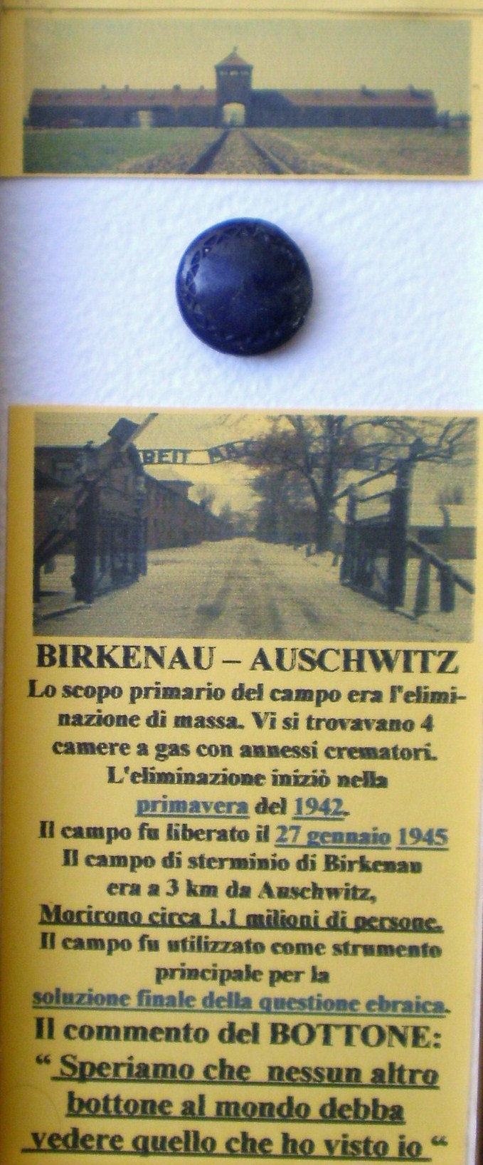 All’interno del Museo clementino, il bottone diventa così testimone di quella immensa tragedia che si vorrebbe non fosse mai accaduta. In occasione delle visite guidate, in questo particolare periodo dell’anno, il Signor Giorgio invita quindi i visitatori a non dimenticare quanto successo e mostra commosso la targhetta apposta sotto al reperto: “Spero che nessun altro bottone al mondo debba vedere quello che ho visto io”.