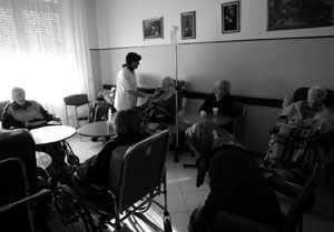 “Diciamo che il primo comfort è il rapporto che tutto il personale cerca di avere con i ricoverati ed è squisitamente umano e cristiano perché l’istituto, a carattere religioso, ha questa particolare impronta prioritaria. C’è perciò un’attenzione anche di tipo spirituale, come lo stare vicino alle persone nel momento della sofferenza, in un’atmosfera profondamente umana, e questo è di conforto ai ricoverati. Parliamo delle attrezzature: i letti possono essere regolati a 33 cm. da terra, e i malati di Alzheimer, se dovessero cadere, non subirebbero fratture. Vi sono materassi antidecubito e reti di tutti i tipi, mentre i servizi igienici sono dotati di maniglioni e specchi orientabili, wc con doccetta per favorire una comoda detersione anche a chi ha una minima capacità di movimento. I servizi sanitari facilitano al massimo l’avvinamento della carrozzina mentre la doccia è dotata di una speciale poltrona molto confortevole. Abbiamo contemplato anche un’apposita vasca per idroterapia dove poter immettere soluzioni disinfettanti (per piaghe). Diverse gamme di attrezzature specifiche per le diverse tipologie dei pazienti. Un’altra vasta gamma di servizi riguarda il riscaldamento, raffrescamento e cambio dell’aria ciclico che avviene almeno tre volte all’ora; le finestre sono tutte dotate di serratura che solo il personale può aprire. Il palazzo è stato completamente ristrutturato e consolidato con criteri antisismici. Per aria e acqua sono stati adottati tutti i sistemi di filtraggio e purezza a scongiurare qualsiasi pericolo di legionella”.