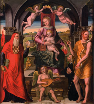 Stiamo parlando del dipinto che si trova a Frontino in provincia di Pesaro-Urbino, raffigurante una Madonna sul trono. Sopra la sua testa due angeli che la incoronano. In braccio il bambino che regge uno scapolare. Alla sinistra del trono c’è san Girolamo che offre alla vergine una chiesa, mentre a destra c’è san Giovanni che indica il bambino. Ai piedi della Madonna un angelo che suona il liuto. Tra il trono e san Giovanni un uomo vestito di nero che in ginocchio rivolge le sue preghiere alla Madonna (si presume possa essere il committente dell’opera). E poi il cartiglio. Risiede qui il mistero, nel cartiglio. il piccolo lembo dipinto, porta infatti il nome di Giovanni Bernardino da Longiano, a data 1560. Attribuita allo stesso anno è la menzione di un frate, Bernardino, longianese, che per un lungo periodo ha ricoperto a Rimini il ruolo di Inquisitore del S. Uffizio della città.