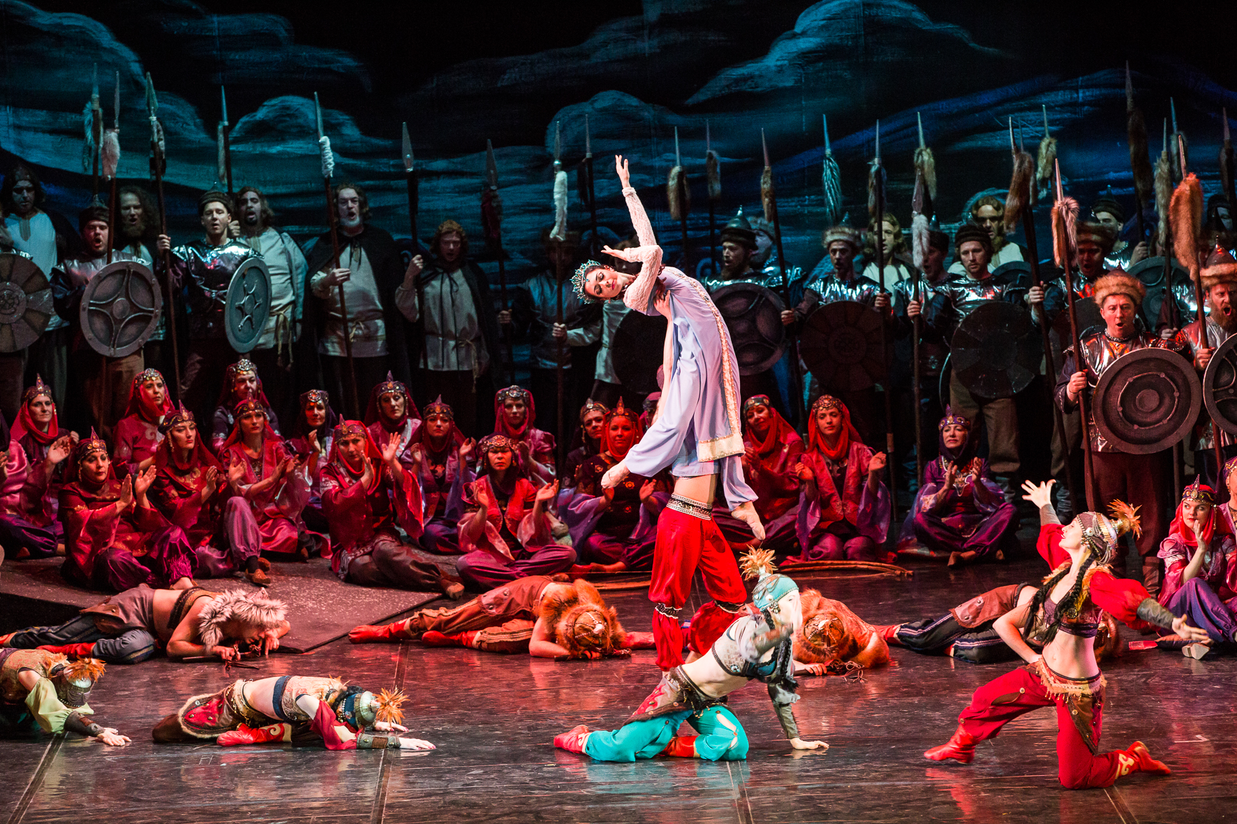 Un po’ fiacco anche il nutrito cast, a cominciare dal baritono Viktor Mityushkin: ben compenetrato nel ruolo di protagonista, ma dall’eccessiva aridità timbrica. Nel grande ruolo drammatico di Jaroslavna, il soprano Anna Litvinova non è apparsa abbastanza incisiva, mentre Dmitry Pavlyuk ha affrontato con voce poco rotonda un personaggio, come quello del fratello dissoluto, prediletto dai grandi bassi del passato. Nel personaggio tenorile del figlio, che Borodin sembra modellare sulla vocalità di Gounod, Vladislav Goray ha sfoggiato le sue carte migliori nel registro superiore. Più completa e rifinita la sua innamorata, il sensuale mezzosoprano Kateryna Tsymbalyuk, così come è apparsa assai apprezzabile il soprano leggero Alina Vorokh, interprete del suggestivo canto alla luna all’inizio del secondo atto. Il bel ruolo del Khan era affrontato, con buone doti di accento ma volume fin troppo esile, dal basso Viktor Shevchenko. Ben a fuoco, dal punto di vista scenico, i due disertori ubriachi, che appaiono ricalcati sui due banditi pasticcioni del Fra diavolo di Aubert (quelli resi familiari dall’irresistibile interpretazione che ne facevano Stanlio e Ollio), nonostante una certa usura vocale del baritono Yuri Dudar e le stimbrature del tenore Alexander Prokopovich.