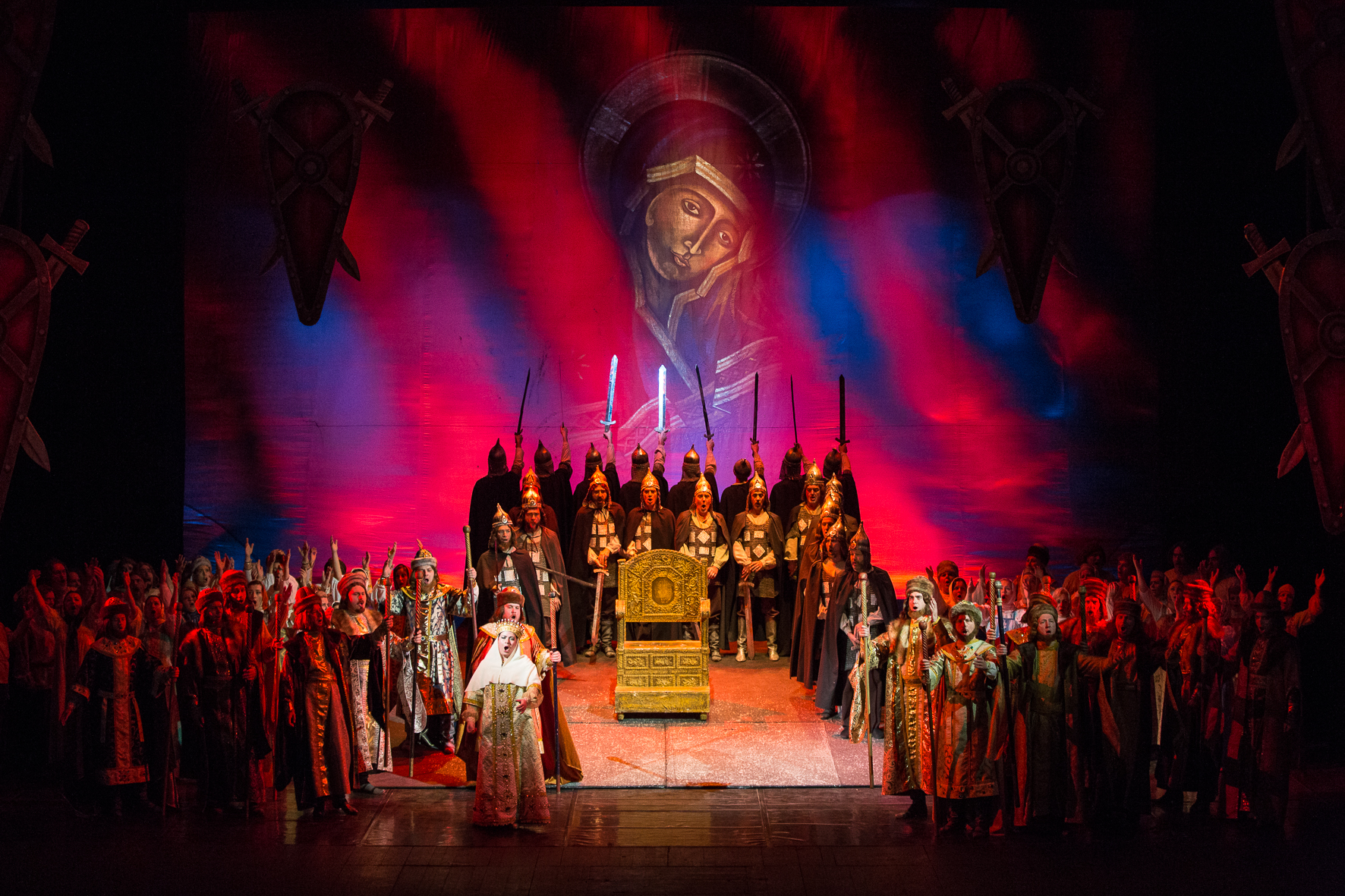 Lo spettacolo proveniva dal Teatro dell’Opera di Odessa (di triestino c’erano solo orchestra e coro, peraltro integrato da alcuni cantori della città ucraina): pur tradizionalissimo, possedeva un certo fascino retrò, illuminato da qualche sprazzo felice. Suggestivo il colpo d’occhio iniziale: la scena disegnata da Tatiana Astafieva, che punta soprattutto su colori smagliati, riecheggiati anche dai costumi, si apre con un velatino su cui è proiettata una bellissima icona della Madonna come doverosa introduzione a un’opera in cui la componente religiosa fa da sfondo alla vicenda. La regia di Stanislav Gaudasinsky procedeva lungo i binari di una consolidata routine (siamo lontani anni luce dall’odierno teatro di regia), con i diversi quadri che si succedono in modo del tutto didascalico: forse un vantaggio nel caso di un’opera poco conosciuta.
