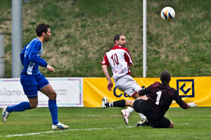 Nella foto, Dario Bettini infila la porta del Fossombrone, per il “cobra” è il settimo centro (foto Serafini)