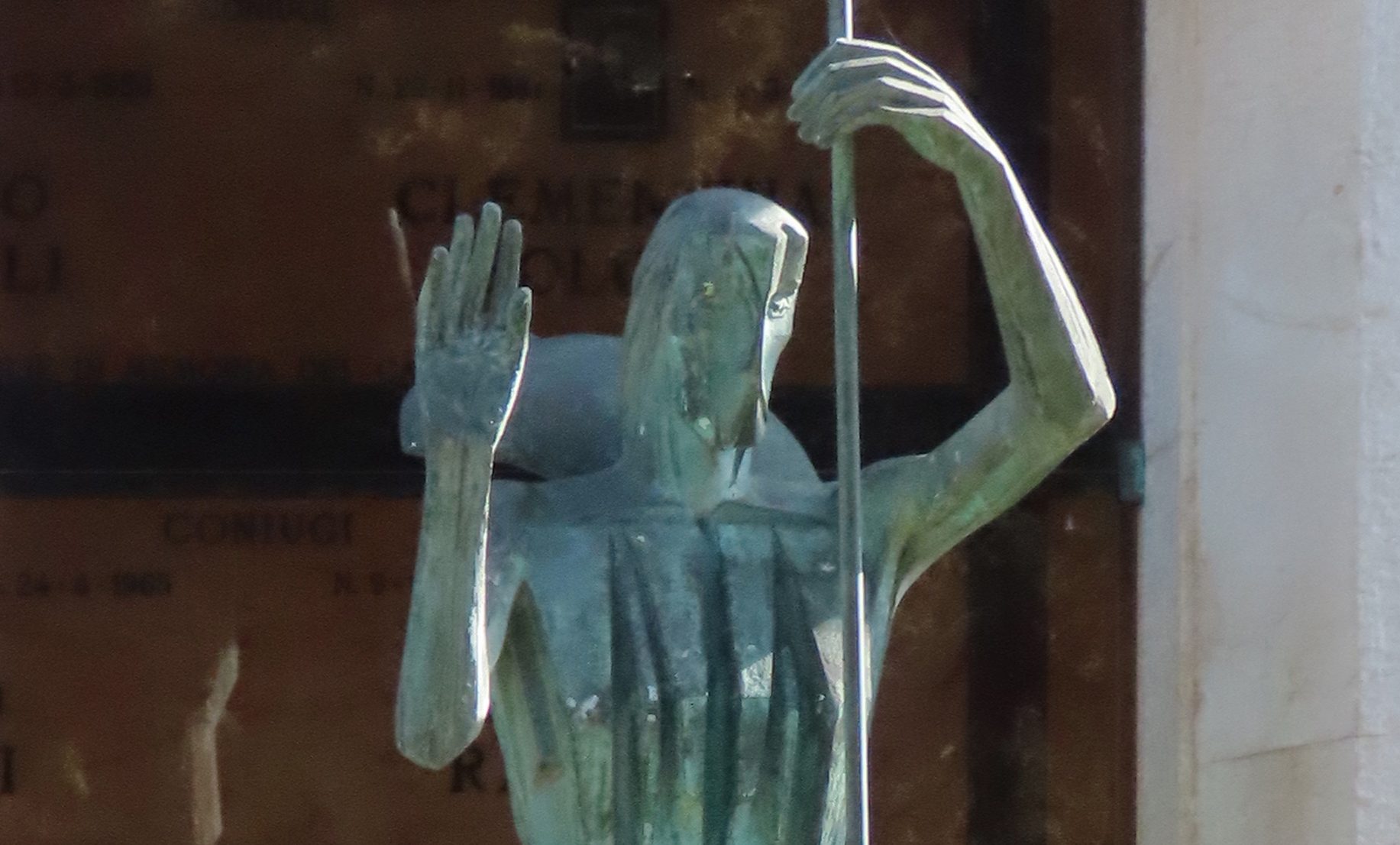In questo periodo dell’anno il sole illumina solo di sbieco e per poco tempo il fianco della cappella a cui è appoggiata la figura; questa è appena toccata dalla luce diretta del sole e sembra emergere dal buio della morte alla luce della vita, come illustrano bene le fotografie qui riprodotte, fatte apposta per noi in questi giorni dall’amico (e fotografo di lungo corso) Luciano Liuzzi, certamente degne di presentare questo capolavoro del nostro bravo scultore e di figurare in questo numero pasquale de ilPonte: con l’augurio che la luce della Risurrezione tocchi il cuore di tutti gli uomini.