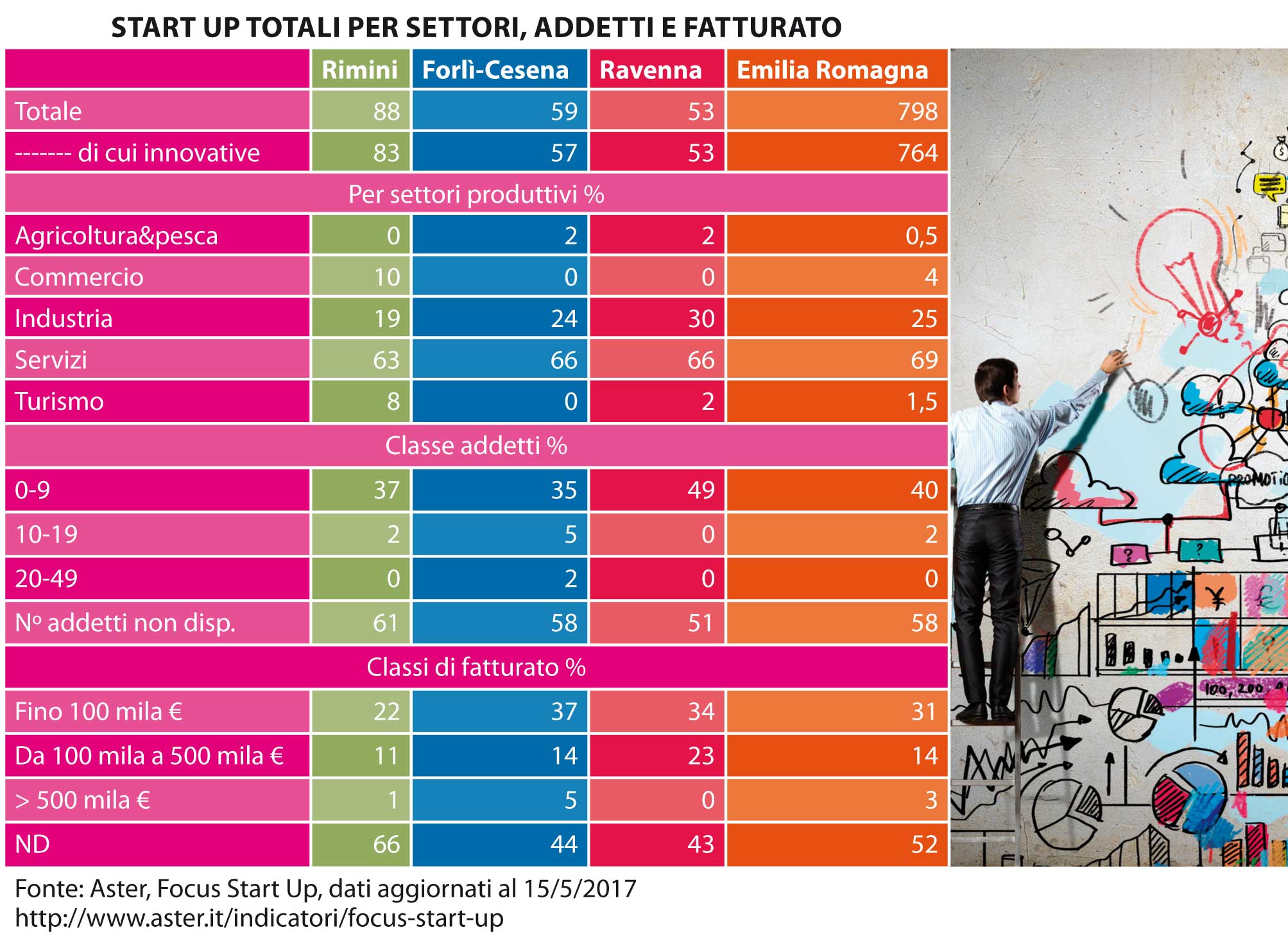 Le start up (nuove imprese), di cui tanto si parla, raccontano la storia di imprese che nascono, in special modo quelle innovative, che godono di un riconoscimento e di un trattamento particolare. Nel 2016, solo le start up hi-tech, in Italia, hanno ricevuto investimenti per 182 milioni di euro, in crescita del 24% rispetto al totale rilevato nel 2015 (147 milioni di euro. Fonte: Politecnico di Milano).A fine maggio 2017 in Romagna se ne contano 200, di cui 193 iscritte nel registro delle start up innovative. Un numero interessate ma ben lontano dal poter sostituire quelle andate perse. In questo panorama politiche, anche locali, che ne aiutino la nascita e la crescita, non dovrebbero mai mancare.