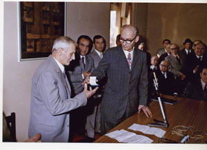 Nella foro, 1971, il presidente della San Gaudenzo Angelo Morolli consegna al suo predecessore Cavalier Luigi Morolli una medaglia ricordo