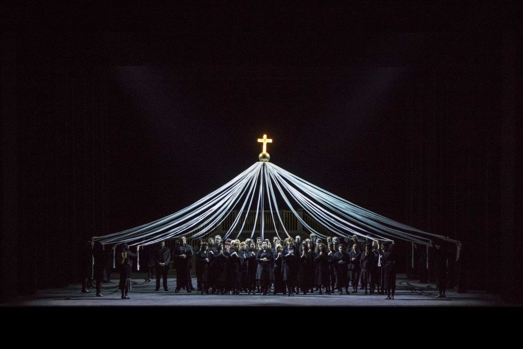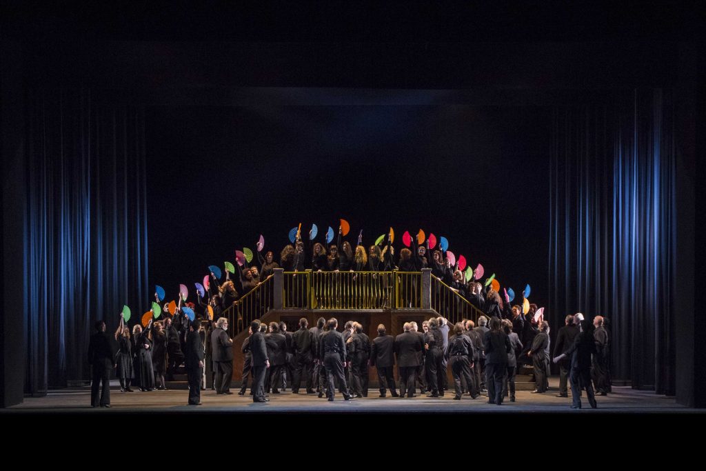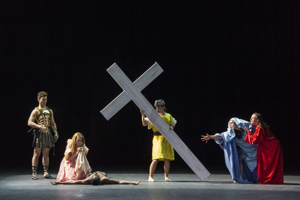Nella Cavalleria è invece Santuzza, rosa dalla gelosia, a svelare a compar Alfio il legame fra sua moglie e Turiddu, determinandone l’uccisione in un duello rusticano. Emma Dante concentra la sua attenzione su aspetti sacri e profani, fede autentica e superstizione, che convivono nell’opera di Mascagni (complice anche una tradizione che ha trasformato la sicilianità di questo atto unico in un retorico stereotipo). Realizza così un’operazione teatralissima, solcandola d’ironia: un carrettino siciliano dove al posto dei cavalli guizzano danzatrici con pennacchietti in testa; i veli neri che portano le donne, intesi come schermo per mostrare o vedere solo ciò che fa comodo; e, soprattutto, la sacra rappresentazione che ogni tanto attraversa la scena: guidata da un Cristo nero, porterà al suggestivo colpo di teatro finale. Le pie donne, infatti, dopo aver appoggiato un manto azzurro su mamma Lucia cui hanno appena ammazzato il figlio, si compongono in un gruppo plastico e spettrale, che evoca il famoso Compianto di Niccolò dell’Arca (nella chiesa bolognese di Santa Maria della Vita), ma soprattutto rimanda all’Urlo di Munch.