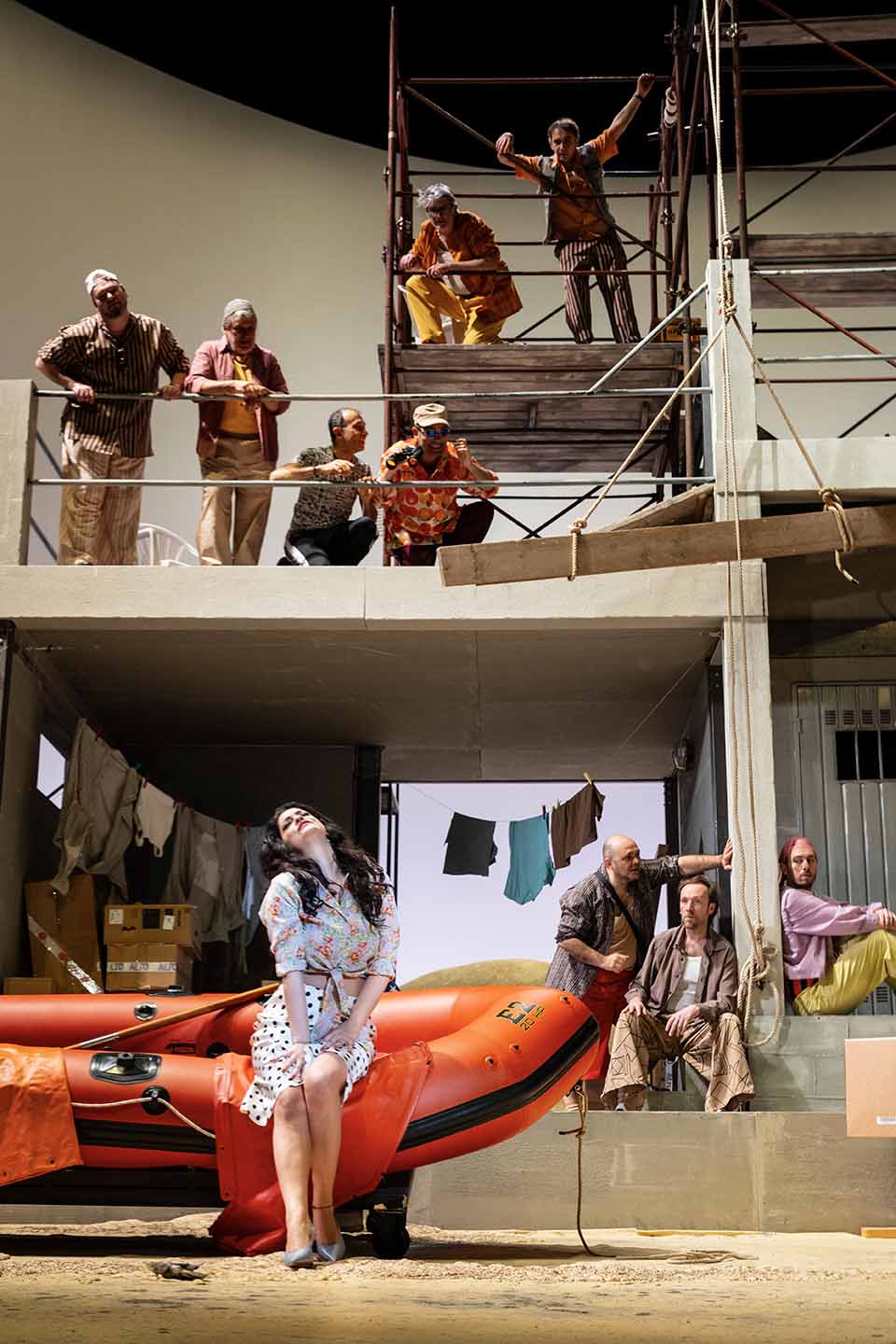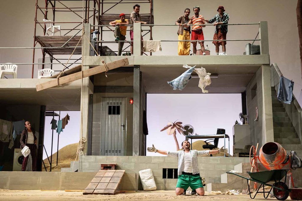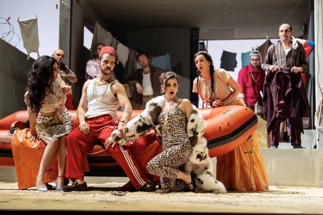 Nello spettacolo ravennate, che sta girando attraverso numerosi teatri, personaggi dall’aspetto poco raccomandabile si affaccendano intorno a una grigia costruzione incompiuta (scena di Nicolas Bovey): cornice dove la cerimonia dei pappataci appare del tutto disinnescata, né trova spazio – ovviamente – quella parodia dei rituali massonici su cui il librettista Angelo Anelli forse intendeva ironizzare. Del resto Mustafà, più che avere la grandezza del Bey d’Algeri, sembra un losco scafista, e i profughi italiani arrivano su un gommone. È tutto ultracolorato, con scelte cromatiche volutamente stridenti: fa girare la testa l’ennesima raffigurazione della spiaggia – adesso di gran moda negli allestimenti operistici – con ombrellone e sedie a sdraio dai colori chiassosi. Naturalmente tutti sono vestiti malissimo (costumi di Arthur Arbesser), anche se la sorte peggiore tocca alla povera Elvira, in tutina leopardata e pelliccione sintetico. Comunque, pure Isabella non scherza: altro che incarnazione dell’eleganza italiana come vorrebbe il libretto. Per fortuna che il mezzosoprano Laura Verrecchia – piglio da primadonna – affronta la scrittura rossiniana con gran disinvoltura vocale e riesce a muoversi con scioltezza in un contesto non facile (riesce a fare un’ottima figura anche in uno sgargiante bikini rosso). Giorgio Caoduro è un Mustafà di caratura baritonale – semmai meno a suo agio negli affondi più gravi – che gestisce le colorature con encomiabile gusto. Un accattivante Lindoro è il tenore russo Ruzil Gatin: grazie alla facilità di emissione, riesce a trovarsi sempre a suo agio pure nella zona più acuta. Forse l’unico personaggio costruito dalla regia in modo appropriato e non volgare è quello di Taddeo, che il baritono Vincenzo Taormina ha reso particolarmente simpatico. Seppure senza mostrare particolari doti vocali, il soprano Gloria Tronel ha interpretato Elvira – è lei a intonare l’esilarante concertato Nella testa ho un campanello del finale primo – più grintosa che querula. Onnipresente in scena, nonostante il poco impegno vocale, Giuseppe De Luca – terzo baritono del cast – è stato uno stralunato Haly. Infine, si è fatta apprezzare nei suoi piccoli interventi il mezzosoprano Barbara Skora, interprete di Zulma. Un apprezzabile contributo vocale e scenico è arrivato dal Coro di Reggio Emilia preparato da Martino Faggiani.