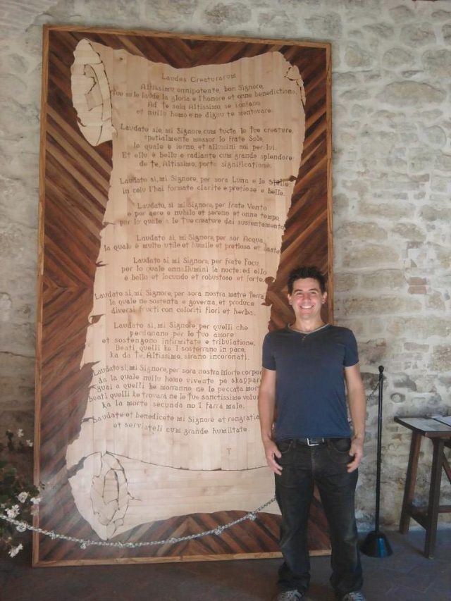 Personaggio io? E scoppia in una fragorosa risata. Contagiosa. Jury Montanari è così, solare e sempre pronto alla battuta, anche quando si sfoga con noi di accusare un po’ di mal di testa per gli eccessivi impegni che lo travolgono da qualche tempo. Artigiano “di giorno”, gestore di un pub di sera (e notte), a 38 anni è uno dei pochissimi ebanisti intarsiatori in tutto il BelPaese. Dall’Antica Ebanisteria Montanari, che porta avanti con babbo Fulvio, un pezzo di storia di Verucchio, ha scolpito capolavori che hanno sorpreso anche la troupe Rai di Sereno Variabile, di passaggio in Valmarecchia pochi giorni fa. Ci racconta di questo come di altre grandi soddisfazioni non senza un pizzico di autoironia: tra una fiera e l’altra con le sue creazioni, oggi esposte tutte nella Casa natale di Michelangelo (“Quando lo racconto mi chiedono: «ma Michelangelo chi? Quello? Sì, quello!» rispondo”), ora ha in serbo un nuovo progetto per la sua Preghiera in legno da Guinness dei primati, un pannello 3×1,80 m., (foto a lato) in stile pergamena, dove sono inserite 11 strofe del Cantico delle creature di San Francesco d’Assisi.