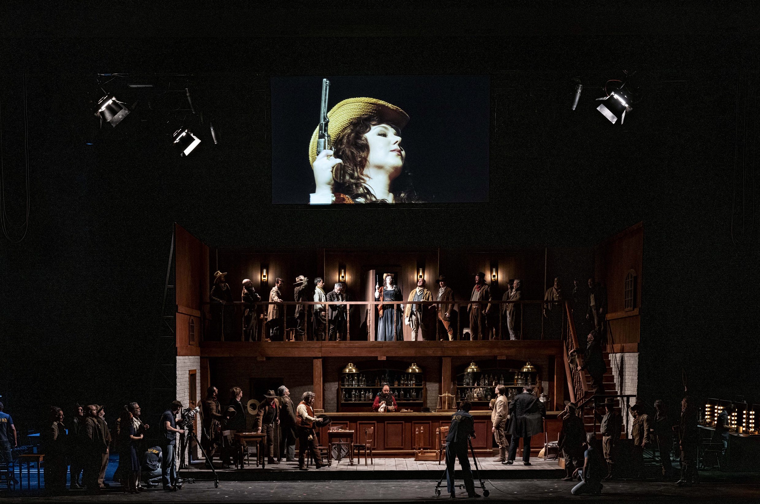 Nello schermo il soprano Jennifer Rowley (Minnie) © Daniele Ratti