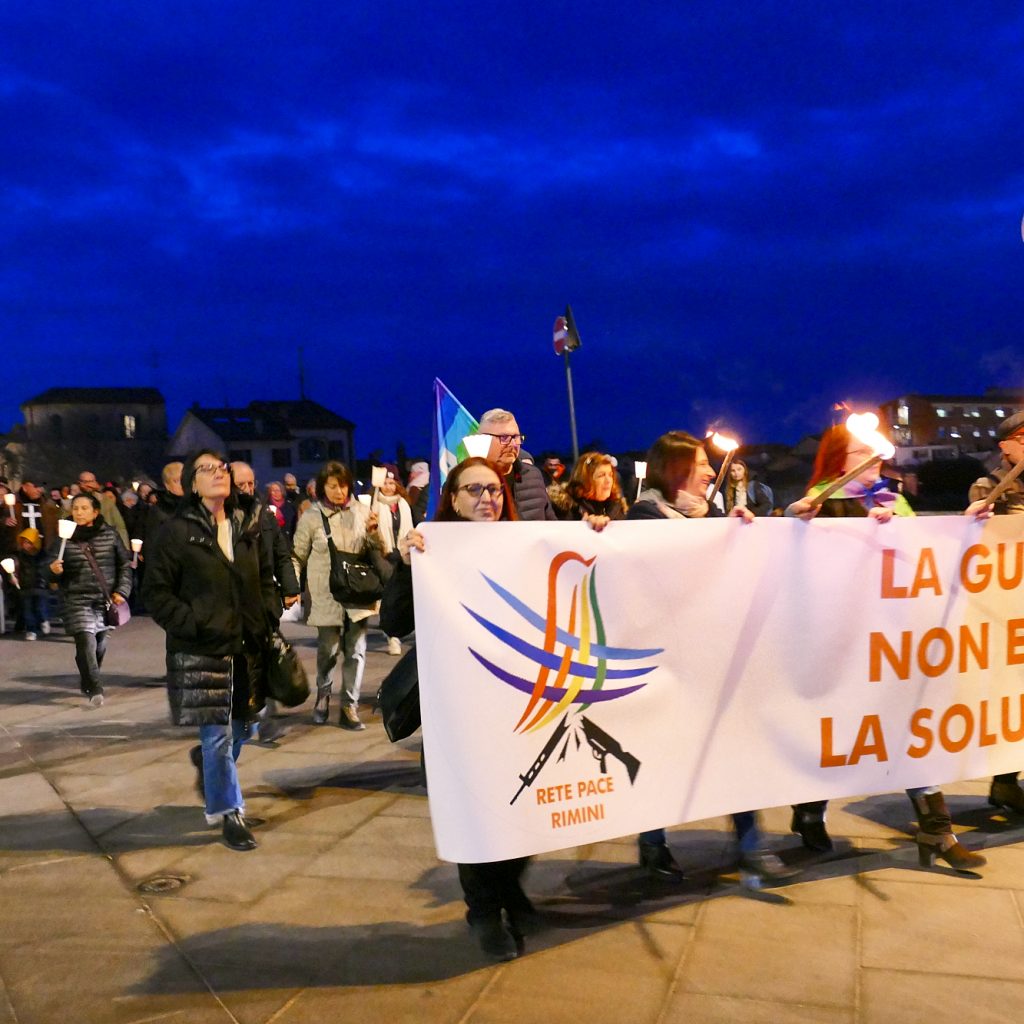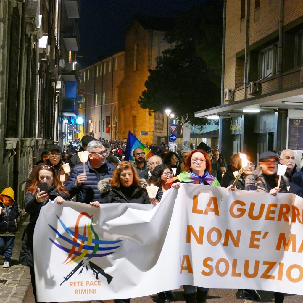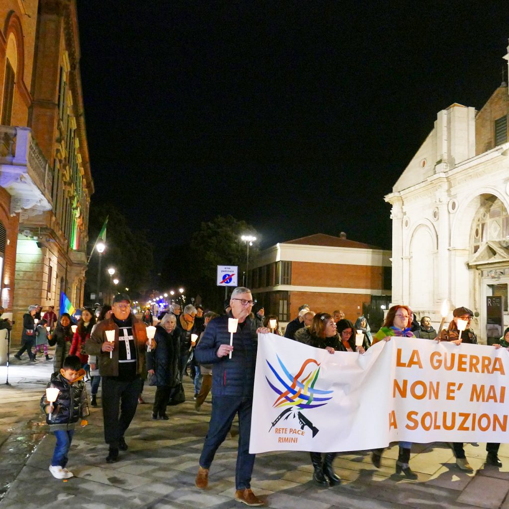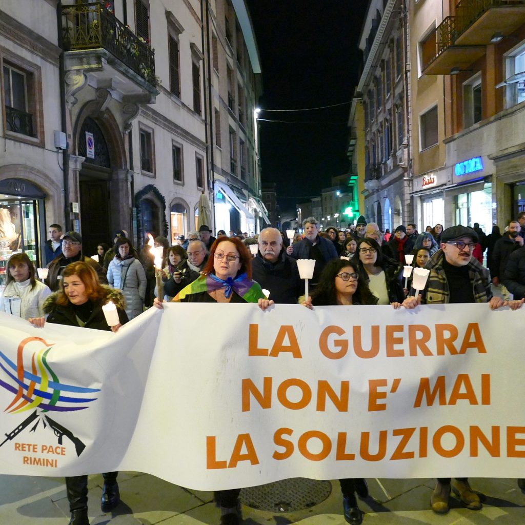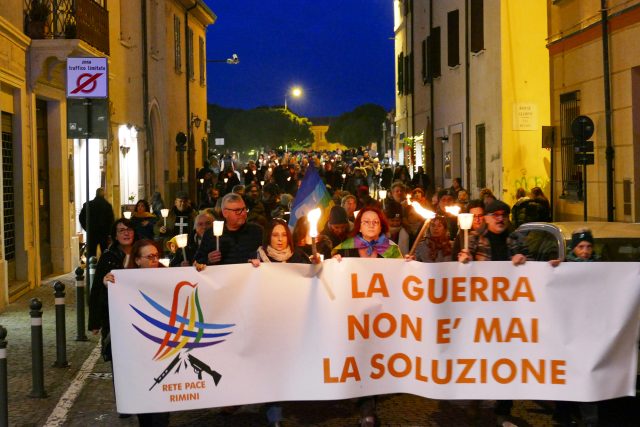 A un anno dallo scoppio del conflitto nell’est europeo, con l’invasione dell’Ucraina da parte della Russia, Rete Pace ha organizzato una fiaccolata. L’iniziativa è stata promossa da 19 sigle fra cui Cgil, Cisl, Arci, Papa Giovanni XXIII, Emergency, Libera. Il corteo è partito dal Ponte di Tiberio, 400 le persone che lì si sono radunate e hanno acceso le fiaccole per poi partire alla volta di piazza Cavour, passando per piazza Ferrari. Tra esse, a sorpresa, anche il vescovo Nicolò. Fra i volti noti in piazza inoltre la presidente dell’Assemblea legislativa regionale Emma Petitti, gli assessori di Rimini Francesca Mattei e Kristian Gianfreda, la sindaca di Santarcangelo, Alice Parma,il segretario provinciale del Pd, Filippo Sacchetti.
