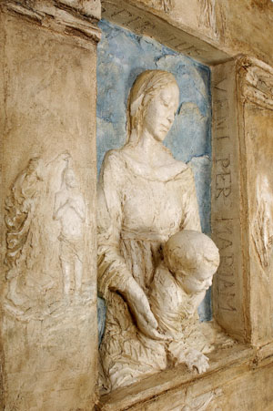 Le terrecotte sacre di Paola Ceccarelli parlano sempre un duplice linguaggio: l’idioma piano, popolare della narrazione religiosa e quello più profondo e sofisticato del significato liturgico dell’immagine. Ma, a ben vedere, il “lessico familiare” o “misterioso” è uno solo: quello dell’antica fede cattolica nella sua profonda, fine semplicità. Nella grande Madonna col Bambino un Cristo infante, in vero molto credibile, si sporge dallo scomparto centrale, mentre è tenuto in braccio dalla Madre, insieme affettuosa e composta: alle spalle di entrambi un ampio cielo azzurro le cui nubi sono, però, le ali di una moltitudine angelica. L’altorilievo dell’opera spezza, dunque, la linea prospettica, per cui noi dovremmo vedere la scena sacra come da una finestra: è il Figlio di Dio che dalla dimensione celeste entra nel nostro spazio terrestre, non siamo noi a rimanere sulla soglia del mondo invisibile. Il Natale è, infatti, la festa dell’Incarnazione del Verbo eterno, o meglio è la solennità con cui si manifesta al mondo quest’evento unico già avvenuto e ricordato il 25 marzo con l’Annunciazione, nove mesi esatti prima del 25 dicembre e in concomitanza col solstizio di primavera in cui, secondo la leggenda, avvenne la formazione del mondo e quella di Adamo: Annunciazione e Natale sono ricordati, dai testi liturgici, come una nuova creazione. Inoltre la tradizione vuole che il 25 marzo fosse avvenuta anche la passione di Gesù: non è un caso se sulla grande cornice che circonda l’opera sono stati raffigurati l’Annuncio a Maria nella parte superiore e il supplizio di Cristo nella parte inferiore: proprio verso la Crocifissione si sporge lo sguardo curioso e sapiente del Bambino, a contemplare il senso terribile e glorioso del suo destino. A sinistra e a destra di chi guarda, il bordo (che qui assume la forma di due colonnine) porta la rappresentazione del Battesimo di Cristo e della Resurrezione da sempre la prima immagine rammenta al cristiano che il sacramento è sia una purificazione, un rinnovamento, sia una forma di partecipazione simbolica alla morte e resurrezione del Redentore; la seconda immagine ci parla, invece, del trionfo di quest’ultimo sulla morte e sull’Inferno.