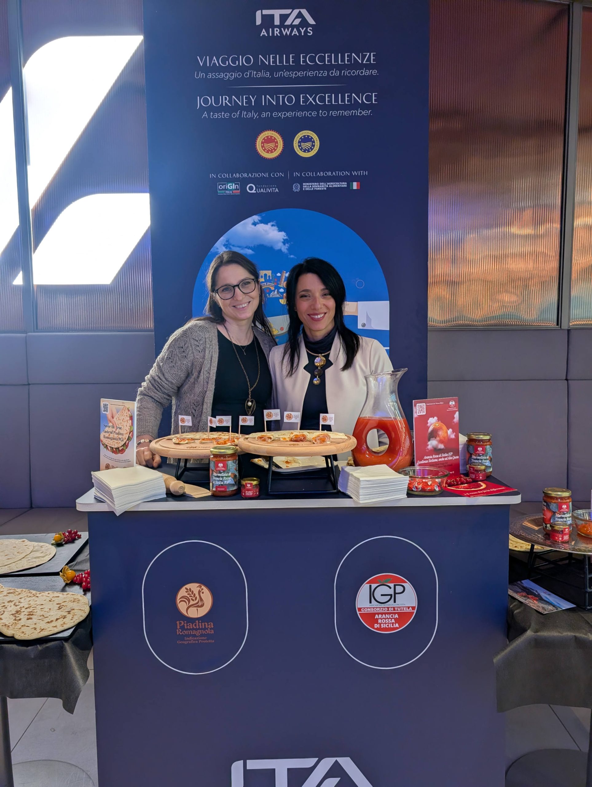 Piadina Romagnola IGP sempre protagonista. Per due giorni (lunedì 24 e martedì 25 novembre) il Consorzio di Promozione e Tutela della Piadina Romagnola IGP è stato nella lounge ITA Airways all’Aeroporto di Fiumicino a Roma nell’ambito dell’iniziativa “Viaggio nelle eccellenze – Un assaggio di Italia”, dedicata alla valorizzazione delle eccellenze agroalimentari italiane a Indicazione Geografica, a supporto della candidatura della Cucina Italiana a Patrimonio Culturale Immateriale dell’Umanità UNESCO. Un viaggio promosso da ITA Airways in collaborazione con Origin Italia (Associazione Italiana dei Consorzi delle Indicazioni Geografiche), Fondazione Qualivita e Ministero dell’Agricoltura, della Sovranità Alimentare e delle Foreste (MASAF).
