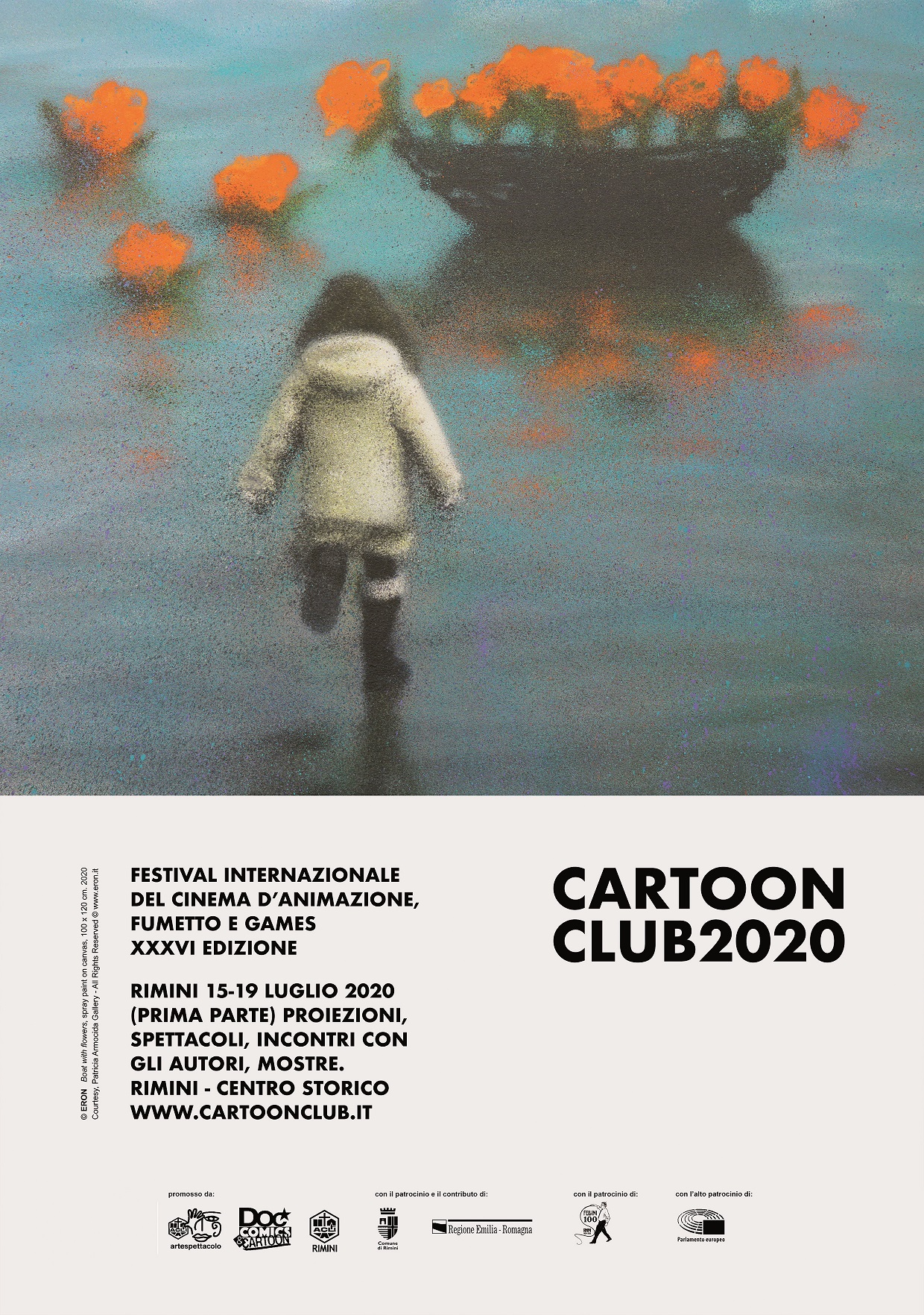 Disegno infantile e realismo pittorico si fondono perfettamente per creare un’immagine dall’atmosfera apparentemente tranquilla. A un secondo sguardo, con tutta la forza e la poesia di una melodia triste ma bellissima, svela però l’attuale dramma delle persone che naufragano nel tentativo di cercare un angolo di serenità nella propria vita. Questa immagine, così carica di suggestione, porta la firma di Eron, ed è il manifesto di Cartoon Club 2020, il Festival internazionale del cinema d’animazione che inizierà mercoledì 15 luglio a Rimini.