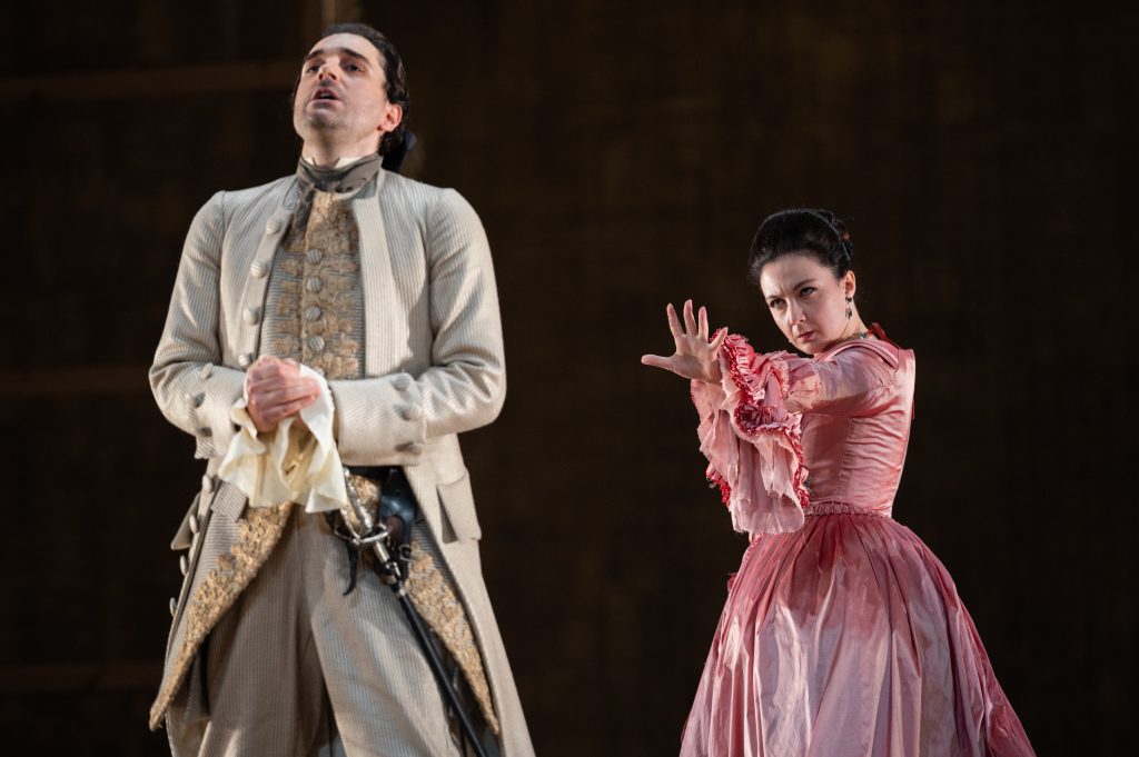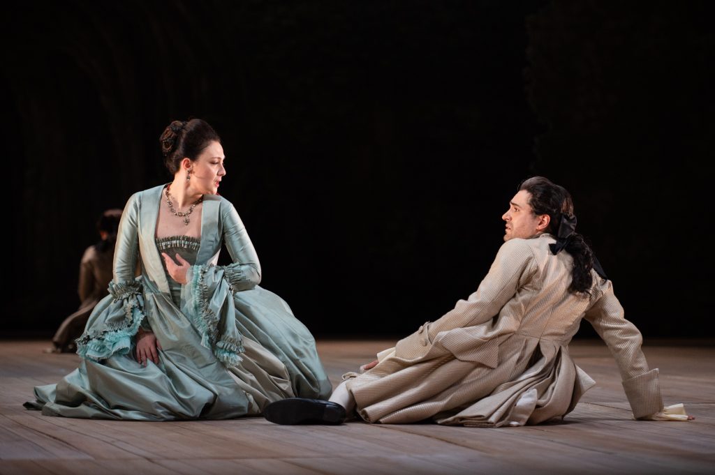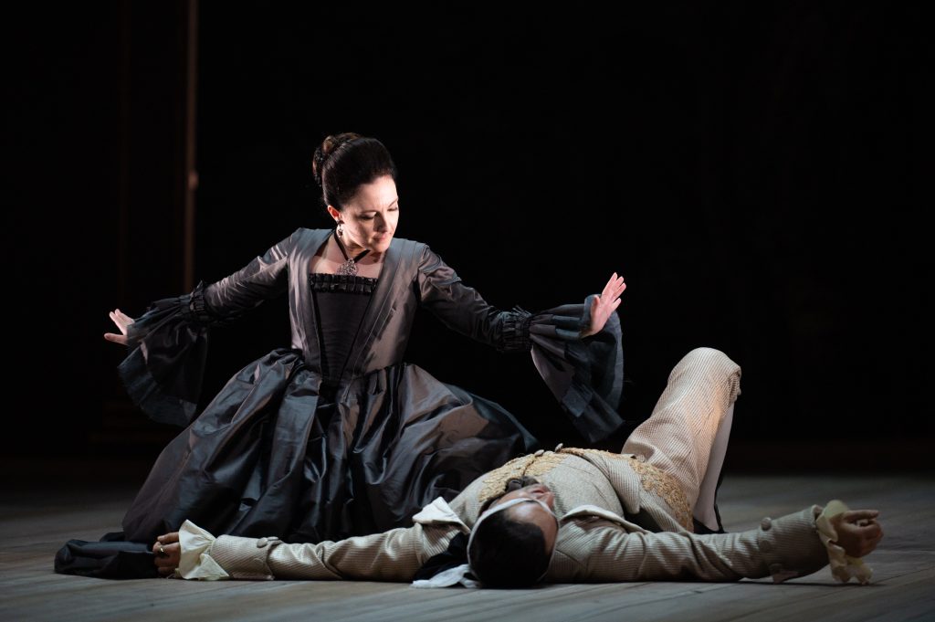 Un nuovo allestimento di Alcina è adesso in scena all’Opera di Roma, firmato dal regista Pierre Audi. Lo spettacolo, in realtà, era nato più di vent’anni fa per le piccole proporzioni di un gioiello barocco come il teatrino reale di Drottningholm. Le scene – o meglio le quinte e il fondale, data la totale assenza di oggetti sul palco – disegnate da Patrick Kinmonth, che firma anche i costumi, riconducono a un’iconica ed elegante visualità settecentesca: molto essenziale e, dunque, lontanissima dai mirabolanti effetti ottenuti con le macchine barocche. Una scelta compiuta, verosimilmente, nell’intento di valorizzare la recitazione, sebbene l’ampiezza del palcoscenico romano non sia apparsa la più adatta ad assecondare queste intenzioni. L’attenzione si è così focalizza soprattutto sulla musica, tanto più che Rinaldo Alessandrini è riuscito a ottenere sonorità sempre credibili da non specialisti del barocco come gli orchestrali del Teatro dell’Opera, ovviamente a ranghi ridotti (ma integrati da due flauti dolci e un arciliuto, utilizzato insieme al cembalo e al violoncello per il basso continuo). Gli strumentisti romani hanno corrisposto sempre correttamente le intenzioni del concertatore: peccato solo per una certa carenza di colori, che avrebbero potuto contraddistinguere con più vividi contrasti le diverse situazioni drammatiche.