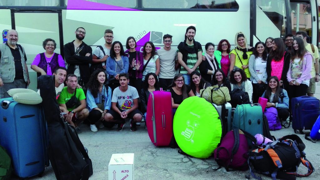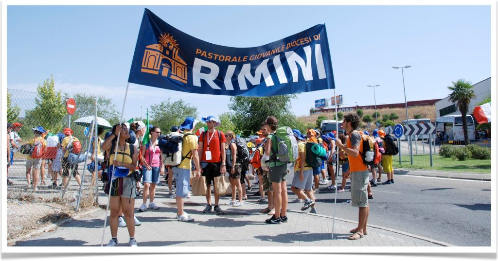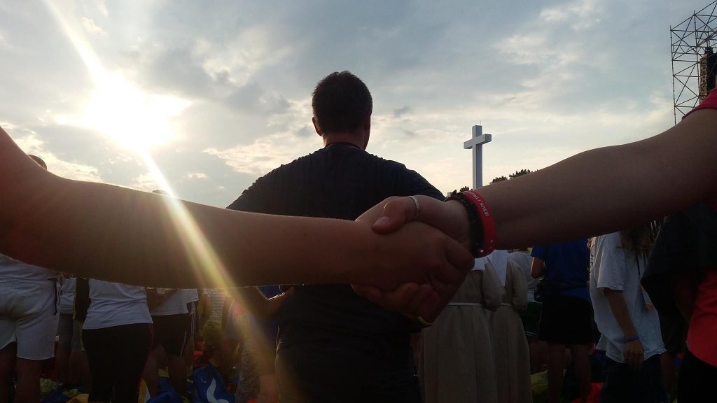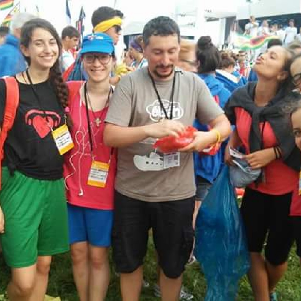 L’assistente dell’Ufficio di Pastorale Giovanile diocesano, don Davide Pedrosi, detto “Pedro”, intento a far divertire i ragazzi a Cracovia durante la Festa degli Italiani