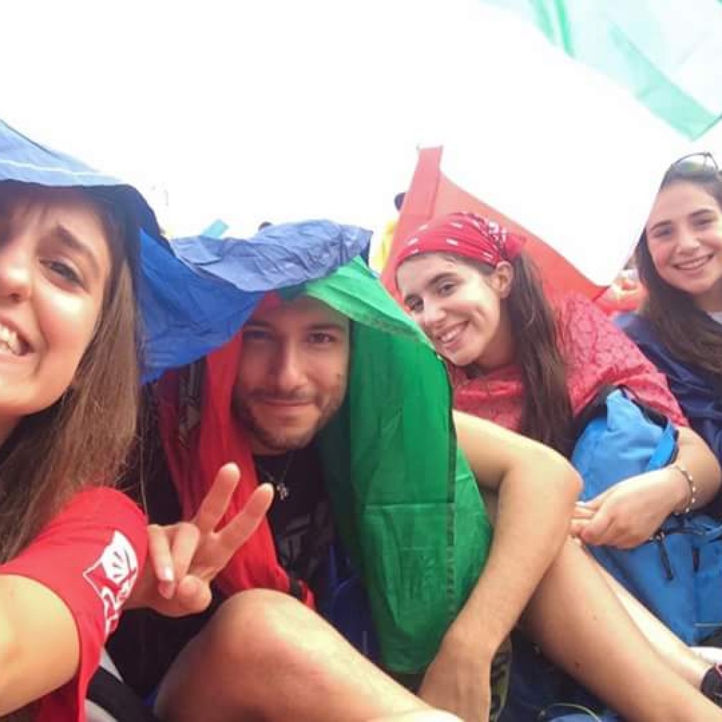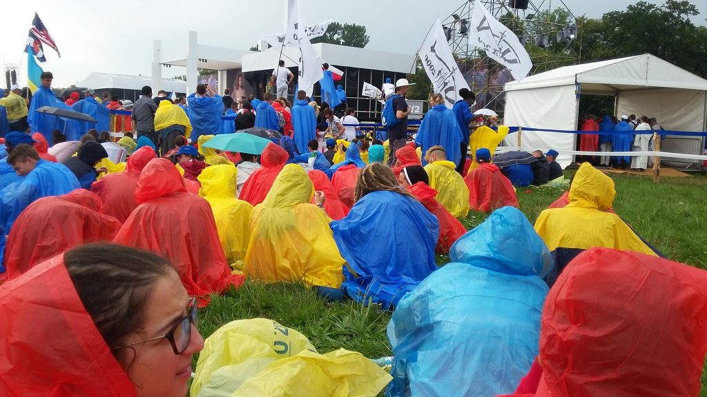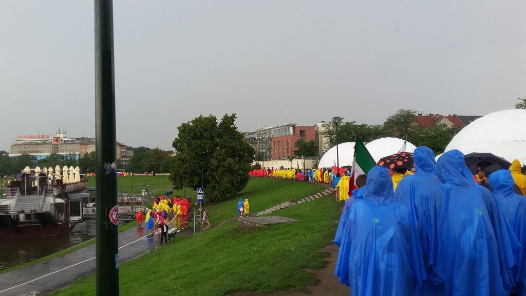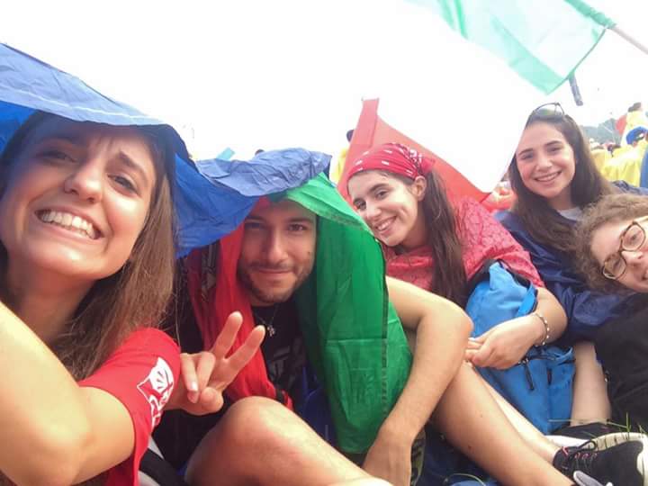La nostra collaboratrice (fresca di maturità) Marta Antonini a Cracovia con il gruppo della Pastorale Giovanile della Diocesi, tenta di ripararsi dalla pioggia