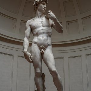 Prenderemo in esame un’opera di uno degli artisti italiani più importanti di tutti i tempi, che maggiormente ha segnato il mondo dell’arte e ha lasciato un segno indelebile all’interno della società moderna e a lui contemporanea. Michelangelo Buonarroti (Caprese 1475-Roma 1564), artista che opera nel pieno Rinascimento, dove domina il desiderio di cambiamento, di rinascita e la grande volontà degli artisti di farsi sentire. Giorgio Vasari (Arezzo 1511-Firenze 1574) è stato un pittore, un architetto e il primo e più importante storico dell’arte. Definisce Michelangelo “divino” esaltando e elogiando le sue opere che hanno raggiunto l’apice invalicabile della perfezione. Il David, realizzato da Michelangelo tra il 1501 e il 1504 a Firenze nel cantiere di Santa Maria del Fiore, commissionato dall’Opera del Duomo è oggi conservato nella Galleria dell’Accademia e viene considerato uno dei maggiori capolavori del Buonarroti. Le dimensioni sono colossali, misura infatti più di 5 metri. Quest’opera testimonia ancora una volta l’incredibile bravura e capacità di Michelangelo: è raffigurato il David, eroe biblico e futuro re di Israele. Il momento è antecedente alla vittoria del guerriero sul gigante Golia, a evidenziarlo è la fronte corrugata, simbolo del pensiero che precede l’atto.