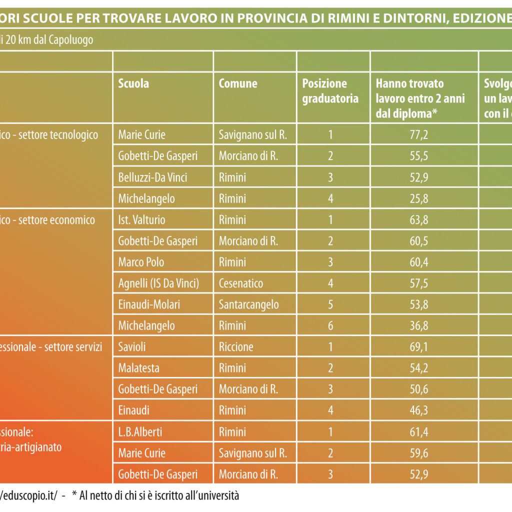La prima graduatoria è costruita tenendo conto dei diplomati che hanno trovato lavoro, anche temporaneo, entro i primi due anni dal titolo. In questo ambito spicca l’Istituto Curie di Savignano con il 77%, quindi il Savioli di Riccione con 69% e l’Istituto Alberti di Rimini con 61%. A seguire tutti gli altri, divisi per settore.