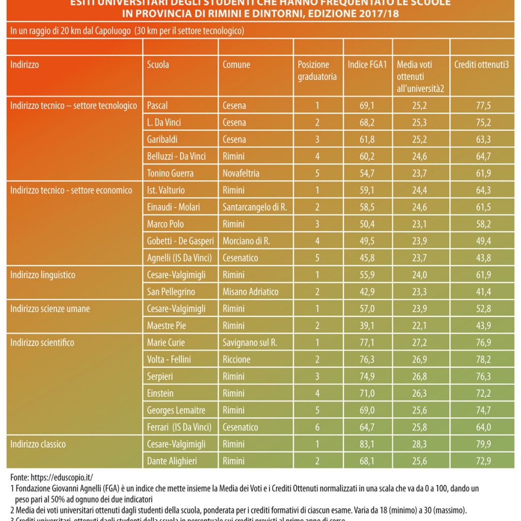 Quanto alla media dei voti, è l’Istituto Valgimigli di Rimini a preparare meglio (media 28,3/30), seguito dal Marie Curie (27,2/30) e dal Volta-Fellini di Riccione (26,9/30).
