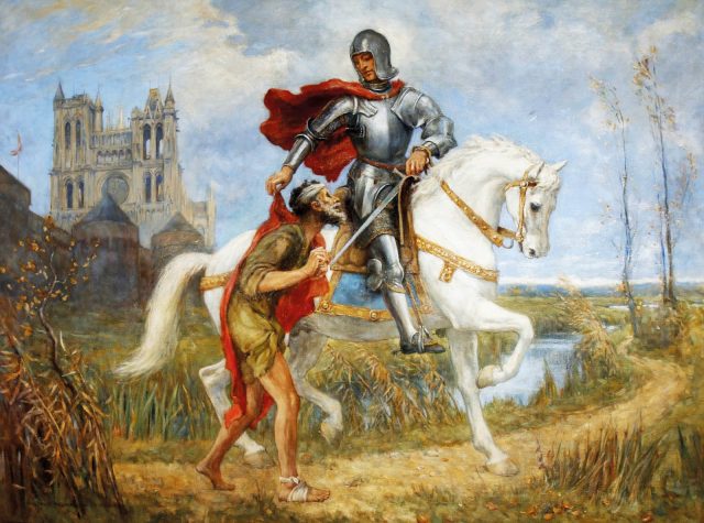 Nella guarnigione romana un giovane soldato a cavallo passa per l’ispezione dei posti di guardia e per la sorveglianza della città. Vede sul ciglio di una strada, abbandonato a terra, un uomo seminudo che trema per il freddo. Preso da pietà scende da cavallo, si toglie il mantello, lo divide a metà con la spada e ne dona una parte al povero, poi riparte per il suo servizio di ronda. La giornata è cupa e il freddo pungente. Improvvisamente le nuvole si diradano e ne esce un sole caldo che riscalda l’aria. Sembra un miracolo: un giorno d’estate fuori tempo. Ma chi era questo generoso soldato romano?