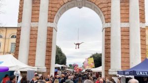 Per creare l’ambiente militare delle legioni romane a cui apparteneva San Martino era presente un gruppo di rievocazione storica di Rimini, che si chiama Legio XIII Gemina, come la legione che accompagnava Giulio Cesare al passaggio del Rubicone. Queste comparse hanno accompagnato la processione, hanno rappresentato la scena di Martino che dona metà del mantello al povero e hanno allestito in piazza un mini accampamento per illustrare la vita militare del tempo.