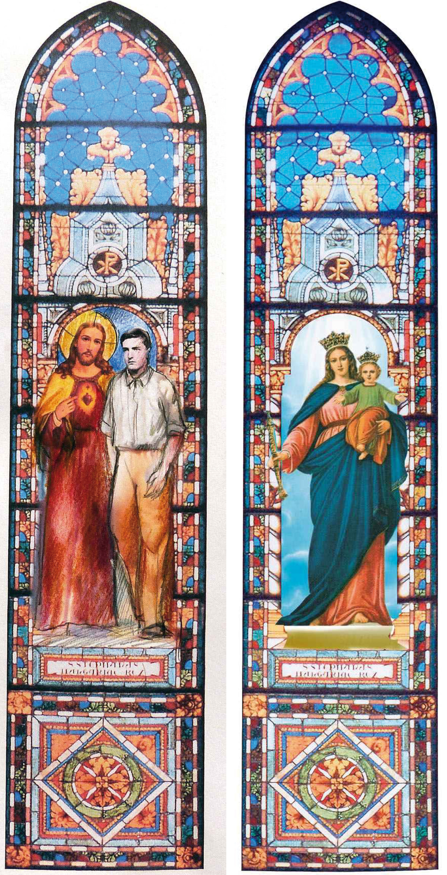 *Maria Ausiliatrice e San Giuseppe. Maria e Giuseppe, lo sposo, tutti e due custodiscono Gesù bambino e, rivolgendosi al nostro sguardo, ci fanno il dono di Gesù. Bella rappresentazione della Sacra Famiglia. Anche in questo caso si tratta di una vetrata doppia.