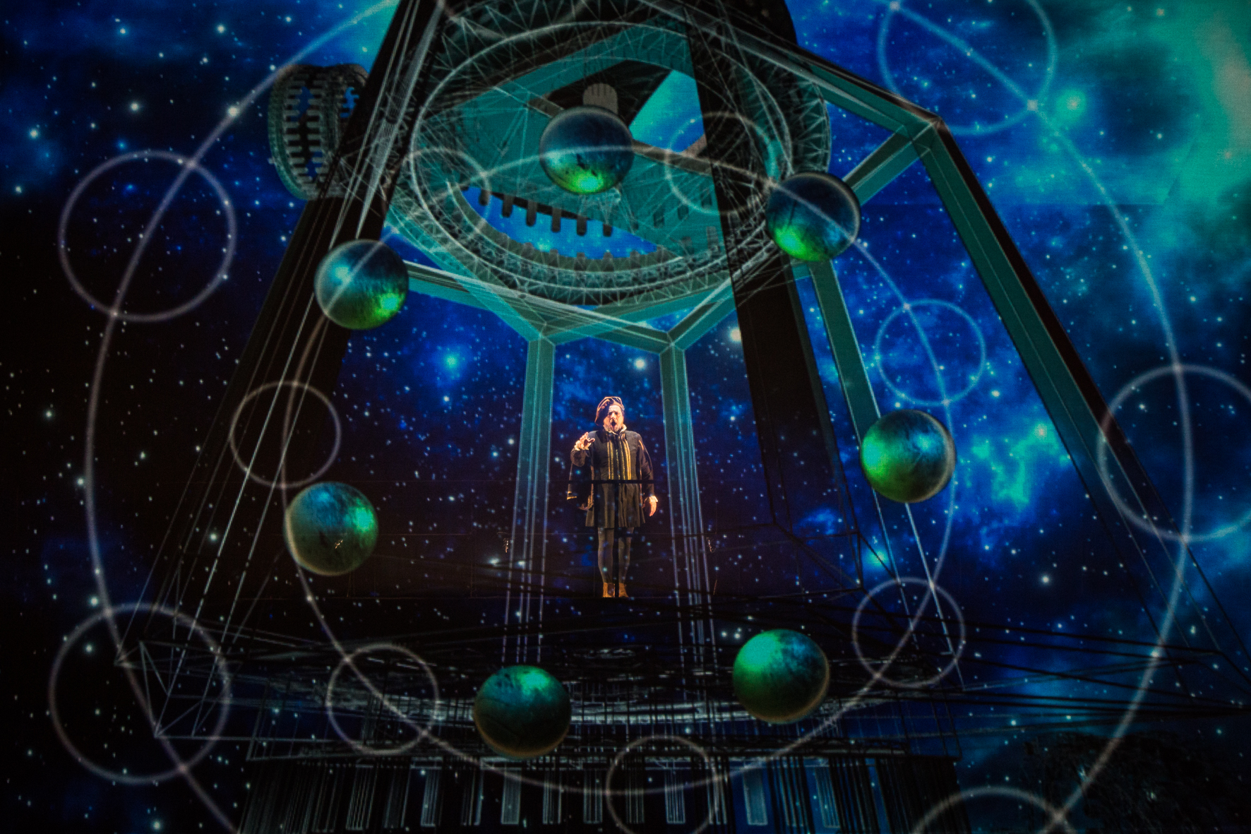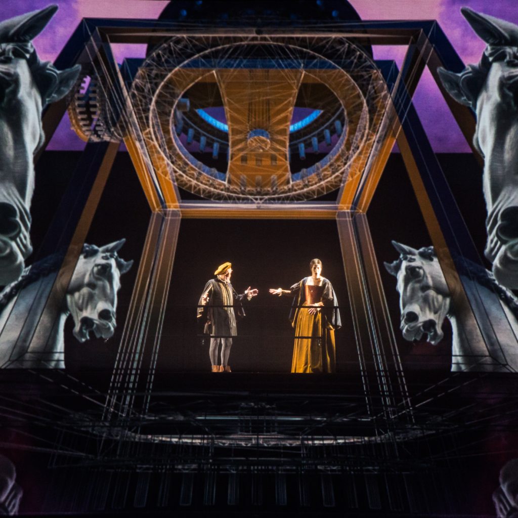 Andrea Certa, alla guida dell’orchestra del Teatro Verdi, ha diretto con apprezzabile precisione gli strumentisti triestini (nell’organico hanno un ruolo rilevante pianoforte e percussioni), avendo sempre l’accortezza di sostenere i cantanti senza sopraffarli. Firmava una regia, particolarmente attenta ai movimenti, la coreografa Morena Barcone, che ha ideato un doppio piano spaziale, in accordo al duplice andamento narrativo: in alto si svolgevano i dialoghi di palazzo, mentre il livello inferiore, quello del palcoscenico, riguardava il mondo esterno. I bei costumi d’ispirazione rinascimentale erano di Andrea Binetti; assai suggestiva la scenografia virtuale realizzata da Federico Cautero: molto ben riuscita la visualizzazione degli ingranaggi delle macchine leonardesche, così come la creazione di inedite angolature prospettiche. Oggi, forse, l’unico modo possibile per far vivere Leonardo in palcoscenico.