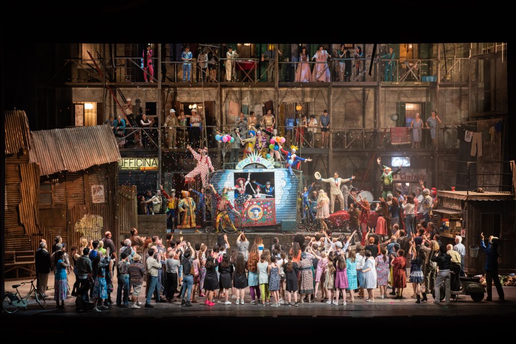 È difficile concepire oggi un palcoscenico altrettanto affollato e sovraccarico di sollecitazioni e colori, al punto da creare un certo effetto frastornante. Rispetto all’originale, tuttavia, è verosimile che Stefano Trespidi – è lui che ha ripreso lo spettacolo – abbia incontrato qualche difficoltà nel disciplinare lo sterminato numero di persone sul palco: dal coro agli acrobati, dai mimi ai musicanti. In questo carnevale, che un po’ satura gli occhi, passano così in secondo piano i singoli personaggi, con gli interpreti che danno talvolta la sensazione di regolarsi in proprio. E se oggi, in tempi di forzato minimalismo – inteso come scelta non solo estetica ma pure condizionata dai costi – sono le luci ad aver assunto una funzione sempre più rilevante, proprio questo aspetto è apparso l’elemento più debole dello spettacolo: c’è comunque da immaginare che l’originale zeffirelliano fosse molto più articolato quanto a disegno luminoso.