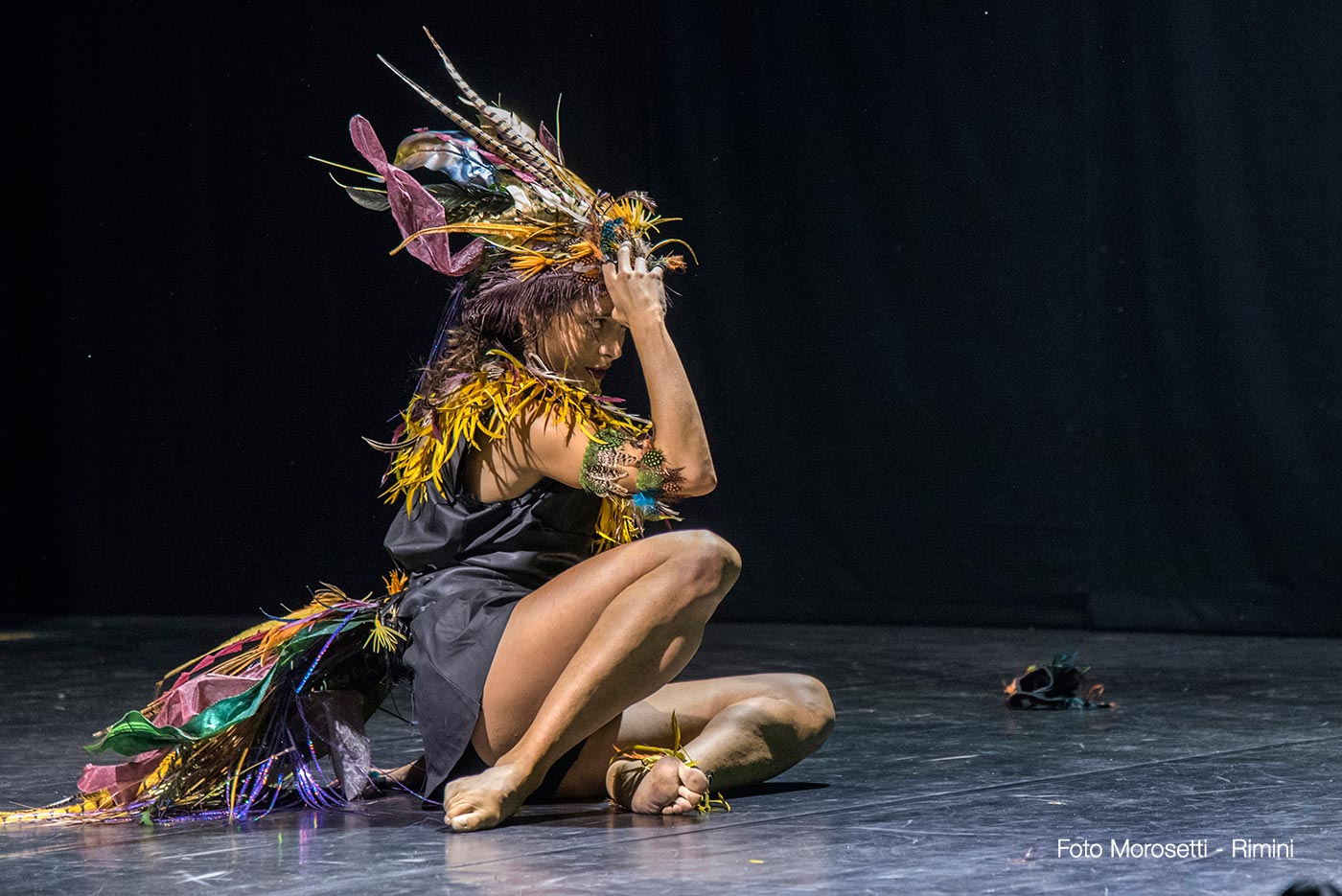 RIMINI, 23 settembre 2017 – Una riflessione sull’amore. Declinato in tanti modi. Si comincia con due biondissimi bambini che prima si rincorrono davanti a una tenda-sipario e in seguito inscenano un ingenuo rituale di seduzione. Si finisce con una coppia di anziani che, dopo timidi approcci di corteggiamento, si denudano per dimostrare come di fonte alle emozioni siamo indifesi e – comunque – nudi, a prescindere da età ed esperienza. Nel mezzo si collocano due giovani danzatrici (le brave Annamaria Ajmone e Sara Leghissa) che si muovono in una foresta pluviale – basta qualche accenno di palme per delinearla – trasformata in campo di battaglia. Rivestite di variopinti piumaggi come due uccelli esotici, ingaggiano una suggestiva lotta che potrebbe essere amorosa oppure mirata solo ad avere la supremazia, o forse entrambe le cose insieme: un filmato con una tigre che attraversa la scena sembra alludere, del resto, a quella ferinità racchiusa anche nei sentimenti amorosi.