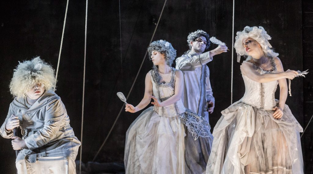 Cimarosa aveva definito con estrema cura, grazie soprattutto ai raffinati disegni degli archi, le fisionomie psicologiche dei personaggi che qui vengono invece relegate quasi al rango di marionette – rese tutte uguali dagli abiti di Alessandra Garanzini, pur eleganti e suggestivi – manovrate dall’invadente regista-demiurgo. La presenza di un cast di giovanissimi, dalle voci acerbe e di scarsa esperienza teatrale, non ha poi giovato a un’opera che richiederebbe invece un collaudato mestiere. Questo vale soprattutto per il protagonista: nella scrittura da basso buffo dell’Impresario, Claudio Mugnaini non possedeva né sufficiente volume né voce tonda e timbrata. A lui tocca l’esilarante aria Vado e giro nei palchetti in cui spiega come organizzerà una claque per assicurare il successo alla canterina: un modo irresistibilmente comico per denunciare meccanismi che, pur con modalità diverse, ancor oggi vigono fra i loggionisti. Dioklea Hoxha, soprano appena ventiduenne, ha affrontato con apprezzabile sicurezza il personaggio della primadonna comica Fiordispina; corretta anche il mezzosoprano Silvia Alice Gianolla, la sua rivale Merlina, alle prese con un’aria molto impegnativa; mentre chiudeva il terzetto femminile Vittoria Licostini, interprete di Doralba. Nei panni di compositore e librettista si sono impegnati con lodevoli risultati il baritono Francesco Samuele Venuti, dotato anche di una buona presenza scenica e capacità istrioniche (deve spesso cantare in napoletano), e il tenore Claudio Zazzaro, per la sicurezza vocale. Infine, il basso Stefano Bernardini si è rivelato convincente attore nel piccolo ruolo di Strabinio, assai ampliato dalla regia.