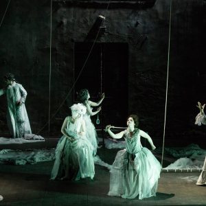 Cimarosa aveva definito con estrema cura, grazie soprattutto ai raffinati disegni degli archi, le fisionomie psicologiche dei personaggi che qui vengono invece relegate quasi al rango di marionette – rese tutte uguali dagli abiti di Alessandra Garanzini, pur eleganti e suggestivi – manovrate dall’invadente regista-demiurgo. La presenza di un cast di giovanissimi, dalle voci acerbe e di scarsa esperienza teatrale, non ha poi giovato a un’opera che richiederebbe invece un collaudato mestiere. Questo vale soprattutto per il protagonista: nella scrittura da basso buffo dell’Impresario, Claudio Mugnaini non possedeva né sufficiente volume né voce tonda e timbrata. A lui tocca l’esilarante aria Vado e giro nei palchetti in cui spiega come organizzerà una claque per assicurare il successo alla canterina: un modo irresistibilmente comico per denunciare meccanismi che, pur con modalità diverse, ancor oggi vigono fra i loggionisti. Dioklea Hoxha, soprano appena ventiduenne, ha affrontato con apprezzabile sicurezza il personaggio della primadonna comica Fiordispina; corretta anche il mezzosoprano Silvia Alice Gianolla, la sua rivale Merlina, alle prese con un’aria molto impegnativa; mentre chiudeva il terzetto femminile Vittoria Licostini, interprete di Doralba. Nei panni di compositore e librettista si sono impegnati con lodevoli risultati il baritono Francesco Samuele Venuti, dotato anche di una buona presenza scenica e capacità istrioniche (deve spesso cantare in napoletano), e il tenore Claudio Zazzaro, per la sicurezza vocale. Infine, il basso Stefano Bernardini si è rivelato convincente attore nel piccolo ruolo di Strabinio, assai ampliato dalla regia.
