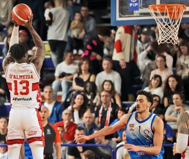 Specialmente l’assenza di Ogbeide incide sull’assetto sul parquet della squadra di coach Ferrari, anche se D’Almeida (nella foto @Nicola De Luigi) chiamato a sostituire il possente centro ha disputato un’ottima partita, regalando ben 16 rimbalzi, coadiuvato da Anumba (9).