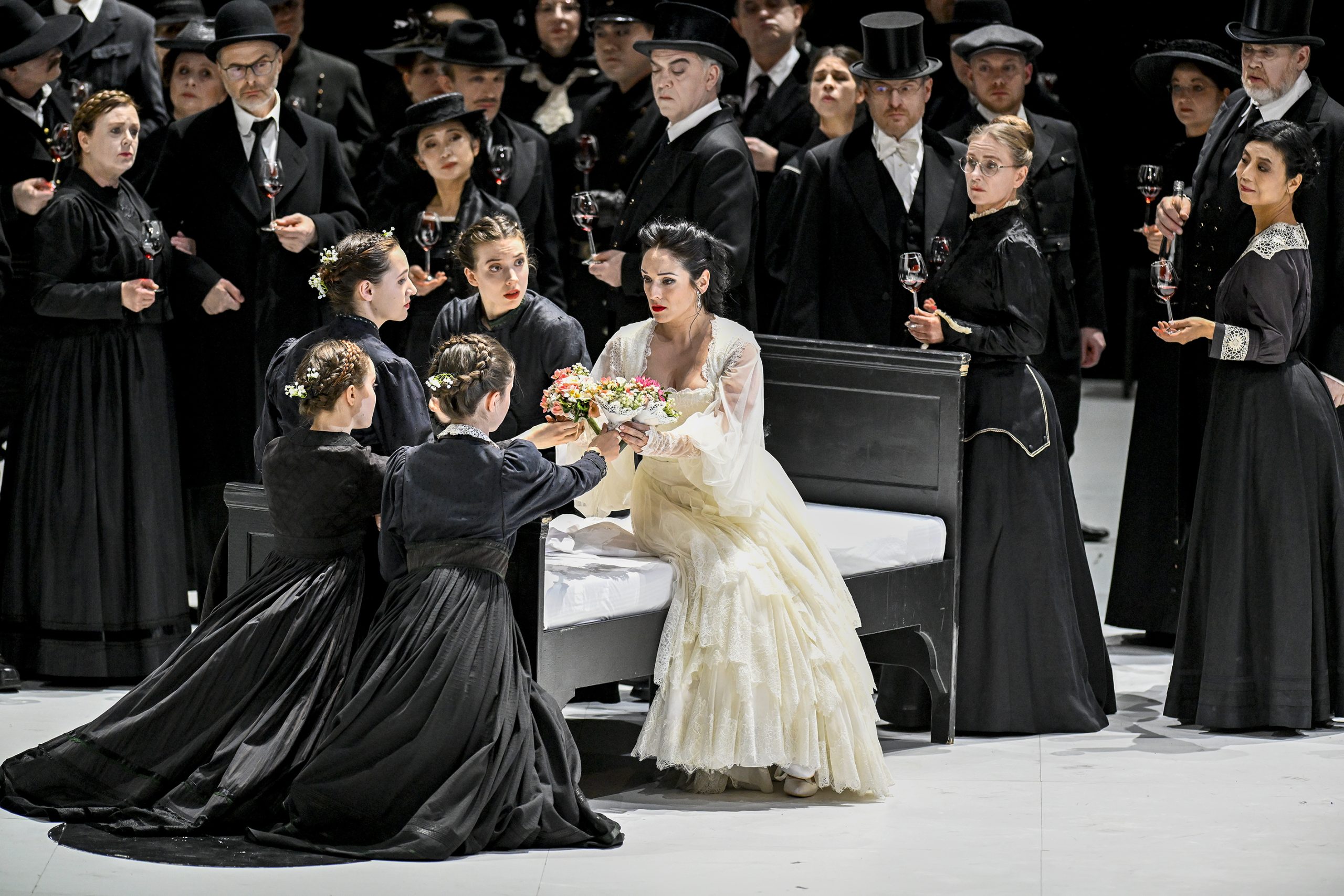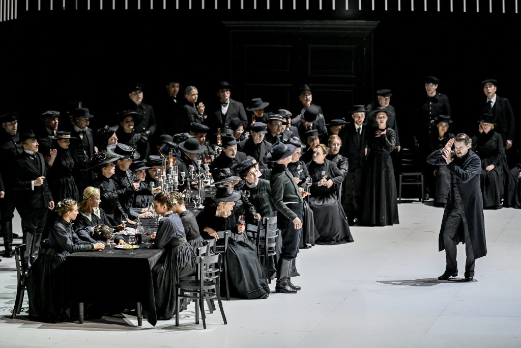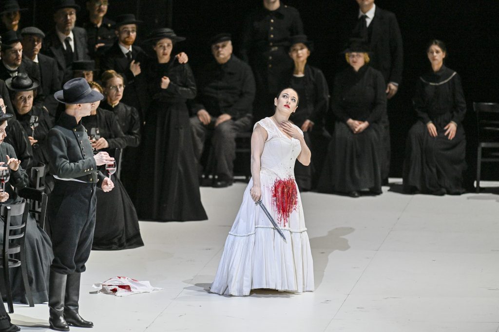 Potentissimo dunque l’impatto visivo, grazie a una serie di neon verticali – con la loro algida luce – e ai bellissimi costumi ottocenteschi disegnati da Gesine Völlm, rigorosamente neri. Pochi gli oggetti nella scena spoglia firmata da Johannes Leiacher: un letto che, da rifugio della protagonista, si trasforma in teatro dell’uccisione del suo sposo; e un lungo tavolo che, da catafalco su cui si avvicendano le bare, diventa punto di aggregazione dei commensali quando stringono le loro alleanze. In un’atmosfera così tetra, se per gli uomini l’unica consolazione sembra la bottiglia, alle donne spetta solo essere sottomesse. Ma Lucia non riesce a farsene una ragione e il suo sperdimento scivola sempre più verso la tragedia: il rifugio nella follia ne rappresenterà solo l’inevitabile corollario.