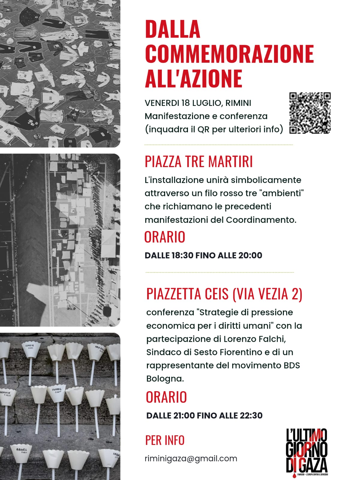 Il Coordinamento cittadino «L’Ultimo Giorno di Gaza» organizza per venerdì 18 luglio un doppio appuntamento che segna il passaggio dalla commemorazione all’azione concreta nella sensibilizzazione sulla crisi umanitaria palestinese.