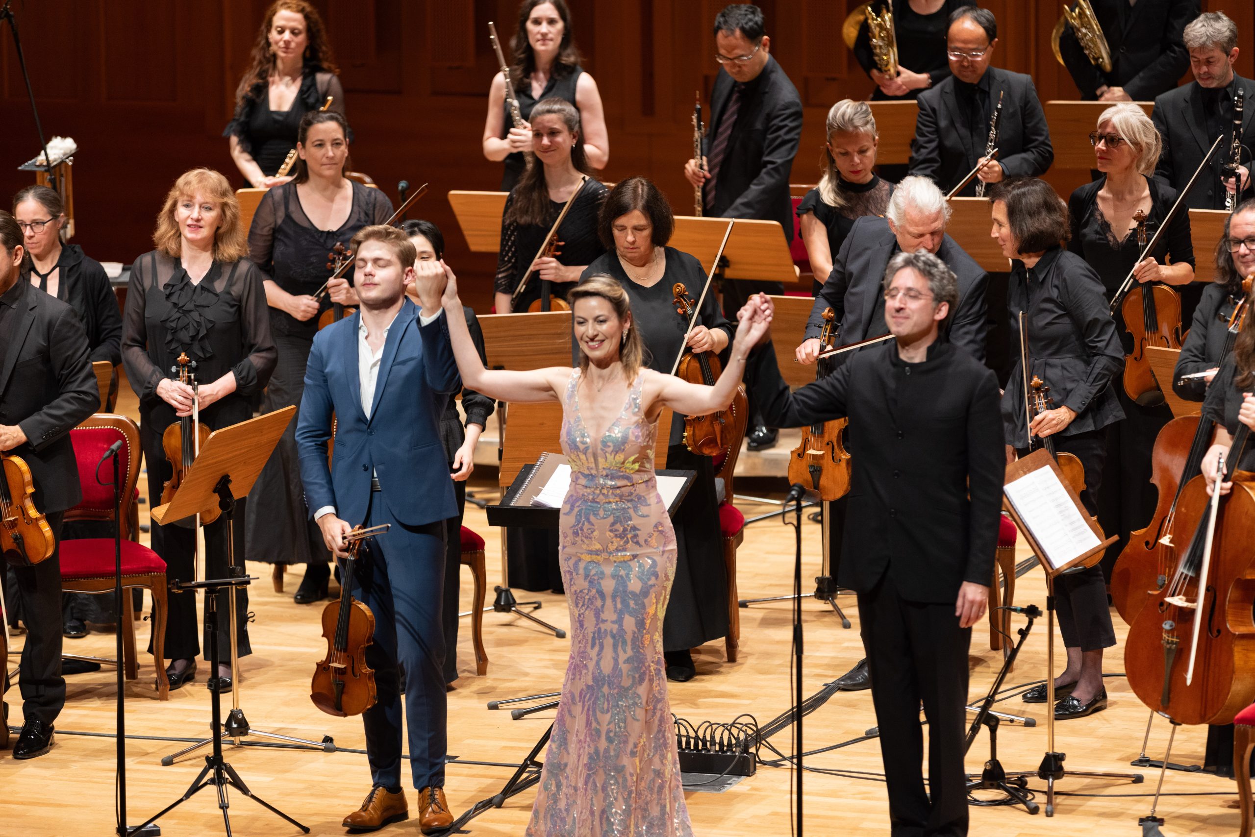 Il violinista Tassilo Probst, il soprano Chen Reiss, il direttore Daniel Grossmann © Max Verdoes