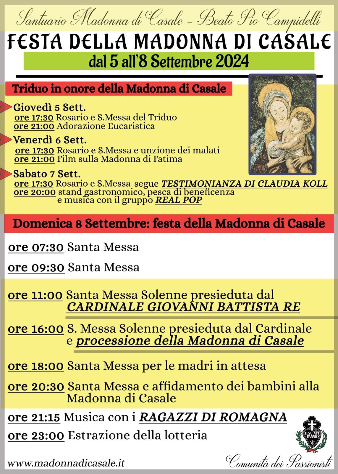 Domenica, festa della Madonna di Casale, la giornata sarà scandita dalle messe delle 7,30, 9,30, 11, 16, 18, 20,30. Le celebrazioni delle 11,30 e delle 16 saranno presiedute dal cardinale Giovanni Battista Re, quella 16 sarà seguita dalla processione. La messa delle 18 sarà celebrata con una particolare intenzione per le madri in attesa, quella delle 20,30 con l’affidamento dei bambini alla Madonna di Casale.