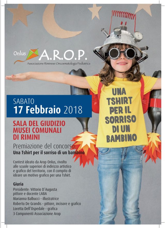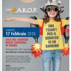 Può una maglietta indurre un sorriso, una bella sensazione, un briciolo di positività in più in un bambino affetto da malattie oncoematologiche e nei suoi familiari? E’ quello che si augura la onlus Arop, che ha messo in campo un concorso, rivolto  alle scuole del territorio a indirizzo artistico e grafico, cui è stato assegnato il compito di realizzare un nuovo progetto grafico per la T-shirt istituzionale dell’associazione. Il contest ora è arrivato alla fine. Alla sua artistica e solidale conclusione. L’atto conclusivo di “Una t-shirt per il sorriso di un bambino” (questo il titolo del concorso), sè in programma Si terrà sabato 17 febbraio dalle ore 9 alle ore 13 presso la Sala del Giudizio Musei Comunali di RiminiInsieme agli studenti che hanno preso parte attiva al contest e ai professori di riferimento, sarà presente il Vice Sindaco di Rimini Gloria Lisi, la Responsabile del Reparto di Oncoematolgia pediatrica dell’Ospedale Infermi di Rimini Dott.ssa Roberta Pericoli, il Presidente di A.R.O.P. Roberto Romagnoli.