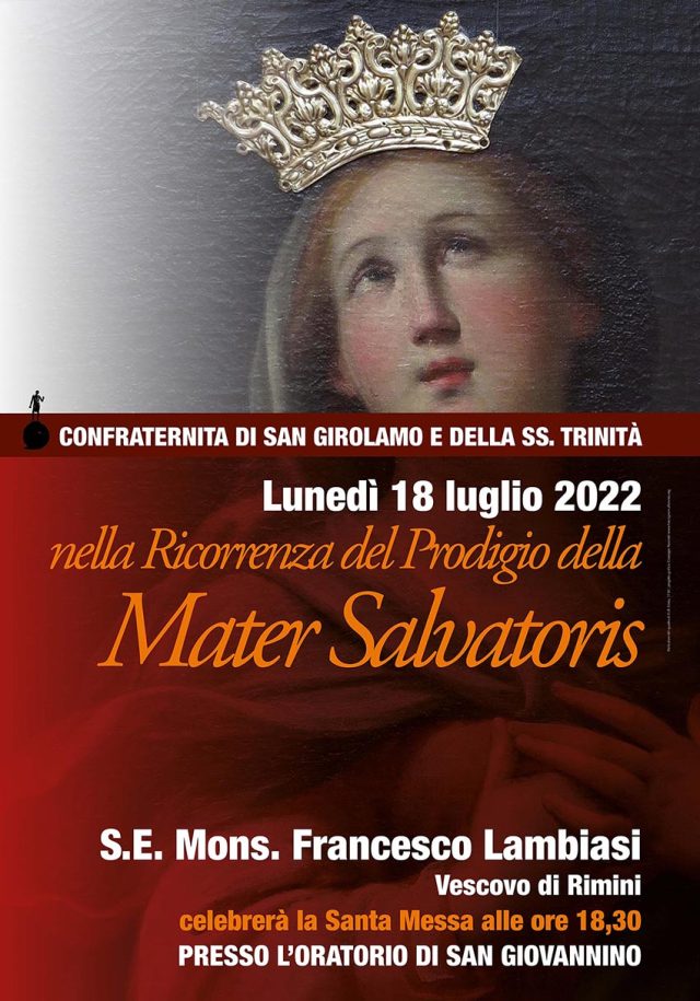 Lunedì 18 luglio è il giorno della ricorrenza del Prodigio della Mater Salvatoris. Per commemorare il miracolo del movimento degli occhi del dipinto, grazie all’iniziativa della Confraternita di San Girolamo, verrà celebrata la Messa alle ore 18,30 presieduta dal Vescovo di Rimini mons. Francesco Lambiasi all’Oratorio di San Giovannino (Via Dante, 18), dove l’opera è conservata.