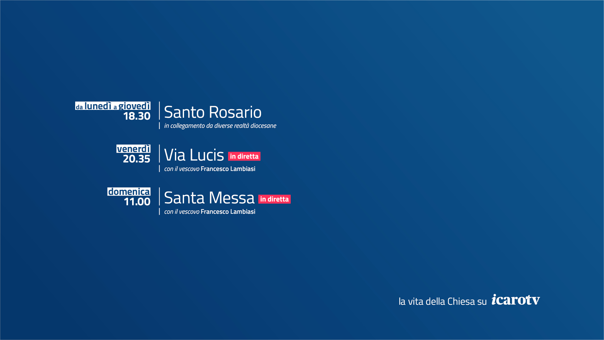 Domenica, alle ore 11, S. Messa festiva, celebrata dal Vescovo Francesco, e trasmessa in diretta da IcaroTv (canale 91 digitale terrestre) e su Radio Icaro.