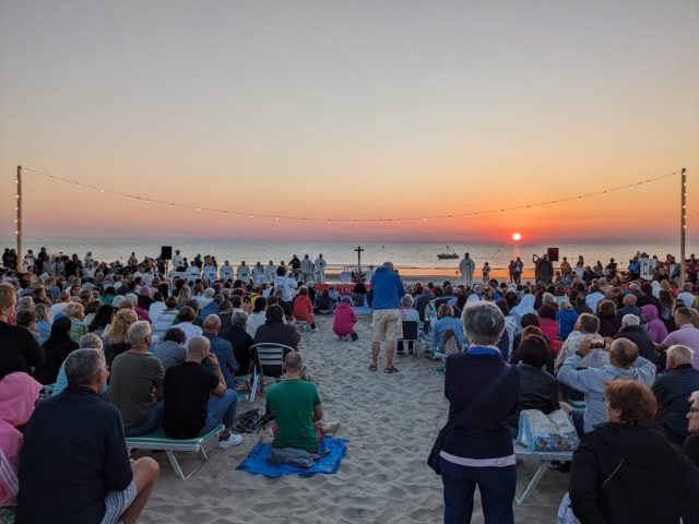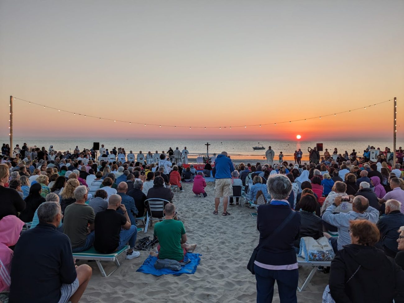 “Strada facendo comprendo che dovevo fare tre sottolineature in particolare: a) Ringraziare per il dono della vita, del nuovo giorno (cosa non scontata); b) Riscoprire la bellezza della natura di cui siamo parte. Il mare, il sole, il cielo, sono un mix stupendo che se adeguatamente contemplato genera gioia e luce nel cuore. Infatti, non è solo la Messa, ma è tutto l’insieme a creare un ambiente che rasserena e illumina, porta pace e serenità. Il sole che sorge dall’acqua, osservato nel silenzio, dona un senso di meraviglia e rigenera l’anima, noi che corriamo continuamente di fretta. Si viene avvolti dalla luce; c) Sottolineo la dimensione comunitaria della Chiesa con una celebrazione ricca di segni che uniscono le persone, fra loro sconosciute. Ovviamente poi si segue la liturgia del giorno.