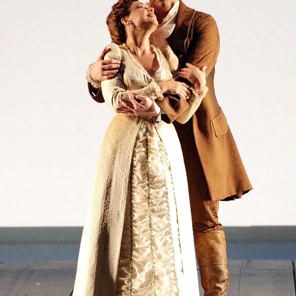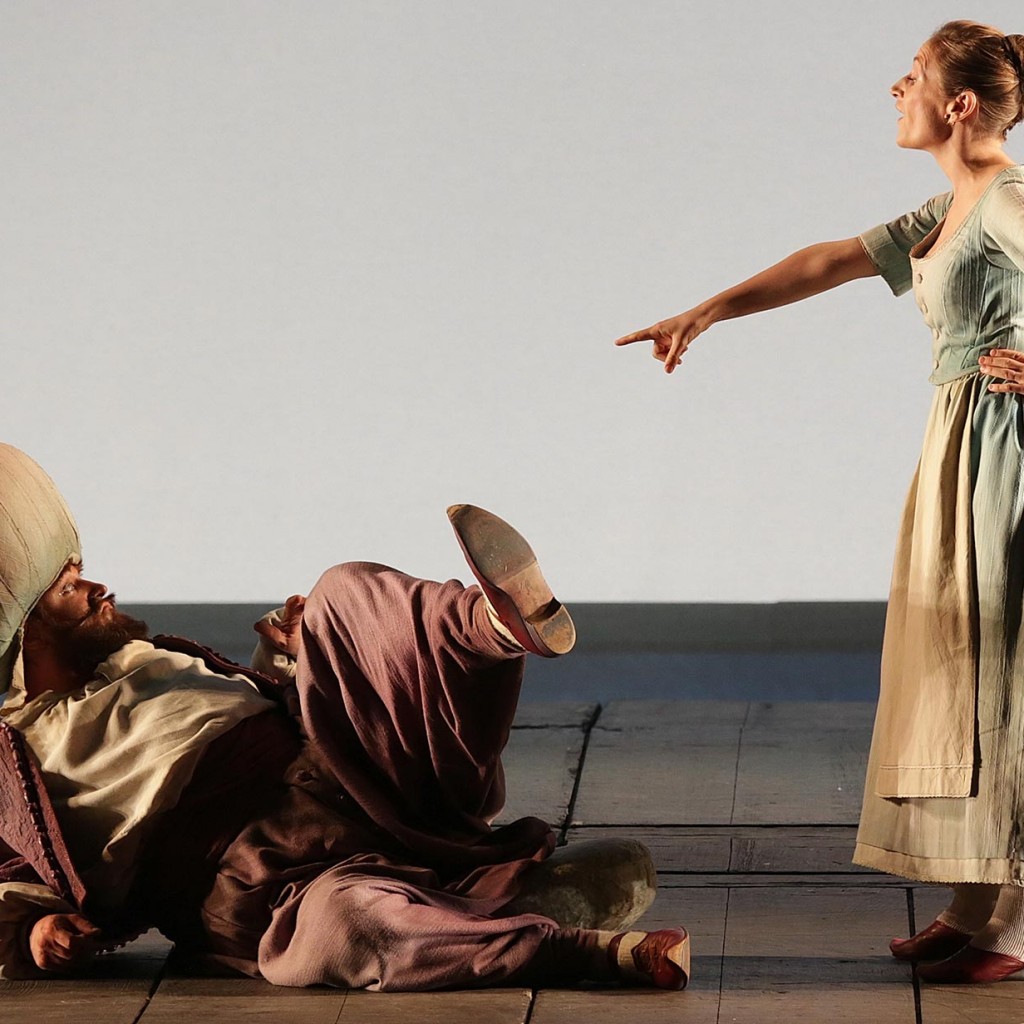 I sei personaggi dell’opera si muovono, nei loro splendidi costumi ideati da Damiani, con movenze nitide e stilizzate, senza mai un gesto superfluo: mentre cantano, avanzano al proscenio come astratte silhouette in ombra (la sensazione è che i personaggi si annullino per lasciare spazio alla musica); quando invece recitano, sono illuminati a piena luce. In questa atmosfera rarefatta e quasi metafisica s’inseriscono con naturalezza piccole gag, che sottolineano le spiritose scaramucce fra Osmin, Pedrillo e Blonde: lontane da ogni forzatura, fanno garbatamente sorridere, senza essere mai sopra le righe.