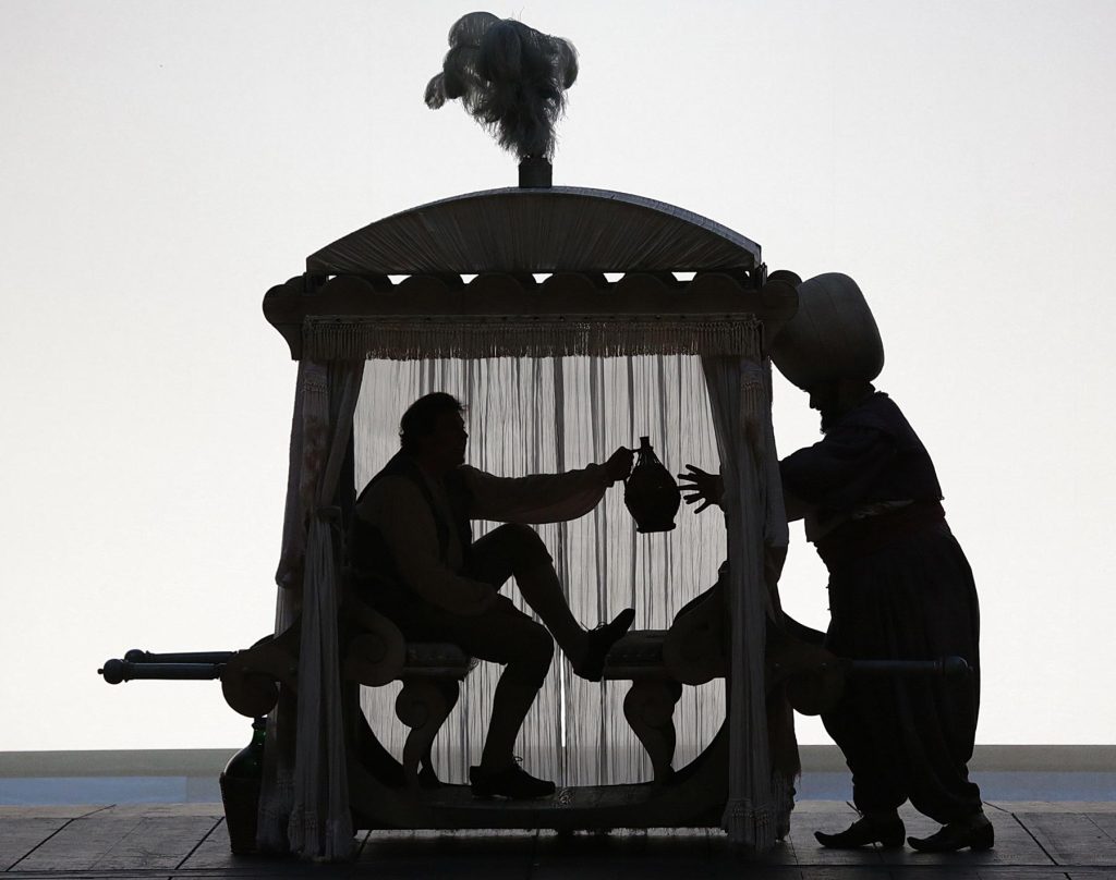 A riprendere questo Ratto dal serraglio, nato nel 1965 a Salisburgo e in seguito riproposto più volte anche in Italia, è stato Mattia Testi, all’epoca assistente del regista triestino: anche a tanti anni di distanza, è riuscito a restituire tutta la raffinata eleganza di un settecento mentale (inconfondibile cifra strehleriana) non solo bellissimo a vedersi, ma dove sono distillati con grazia numerosi elementi della commedia dell’arte. Ammirare le quinte dipinte di Damiani, capaci di suggerire con mano leggera l’ambientazione turca che fa da cornice a questo Singspiel del 1782, assume il significato di un piacevole tuffo nella grande tradizione scenografica italiana, che aveva fatto della bellezza la sua principale forza motrice: da un lato occasione di rimpianto per un artigianato purtroppo scomparso, dall’altro fonte di malinconia per un’innocenza ormai perduta, a seguito dei recenti eventi storici che hanno reso tragica – e in modo irreversibile – la nostra percezione del vicino oriente, spezzando il sogno illuminista al quale si rifaceva anche Strehler.